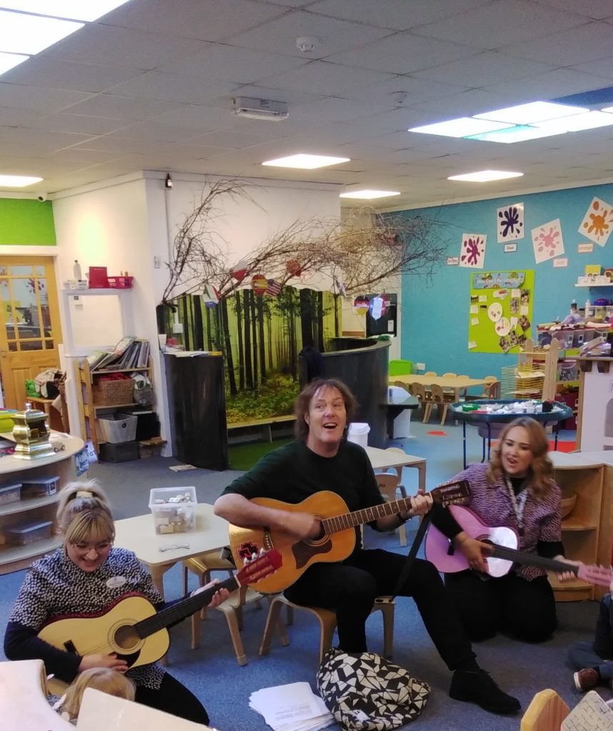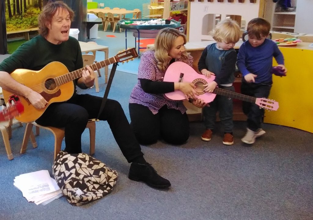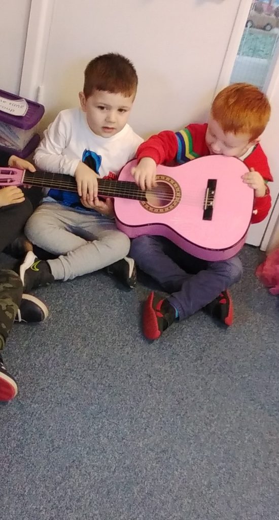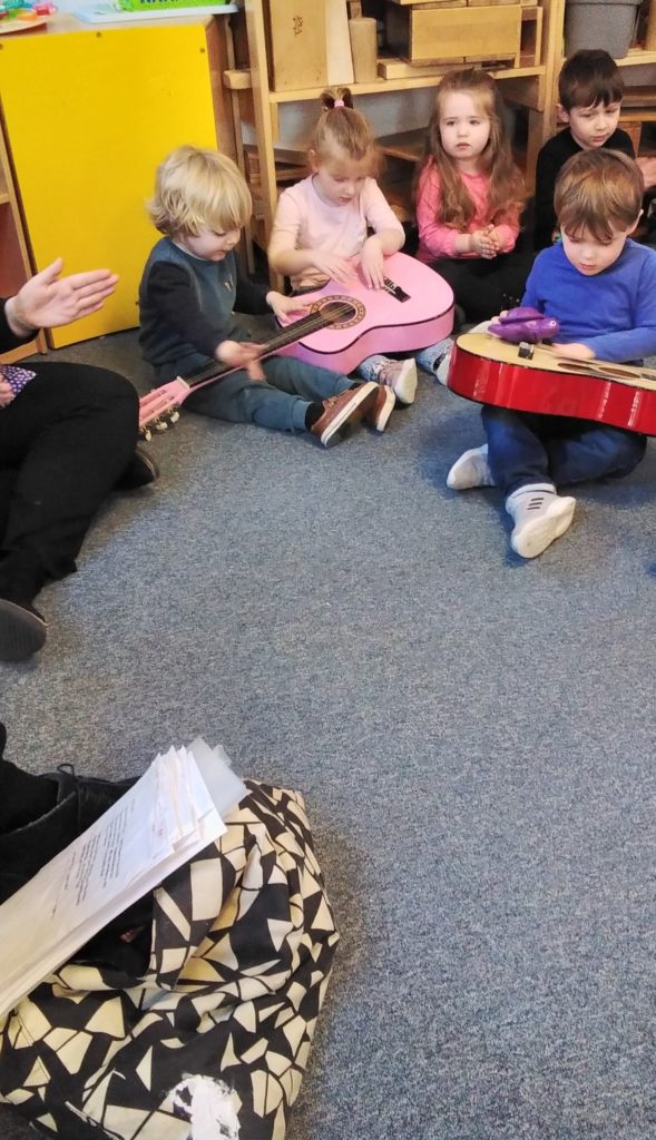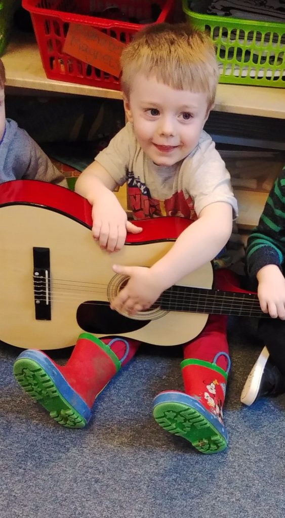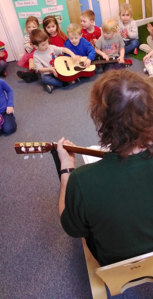 A ‘Fabulous Friday’ morning saw the arrival of Paul the music man who came to lead a music session. Miss Georgia brought out our special guitars, so the children could take turns in playing a tune along with Paul. Later, everyone enjoyed joining in with action songs. Stomping as dinosaurs was a clear favourite! Miss Jess and Miss Georgia could hear lots of excited giggles and see very big smiley faces.