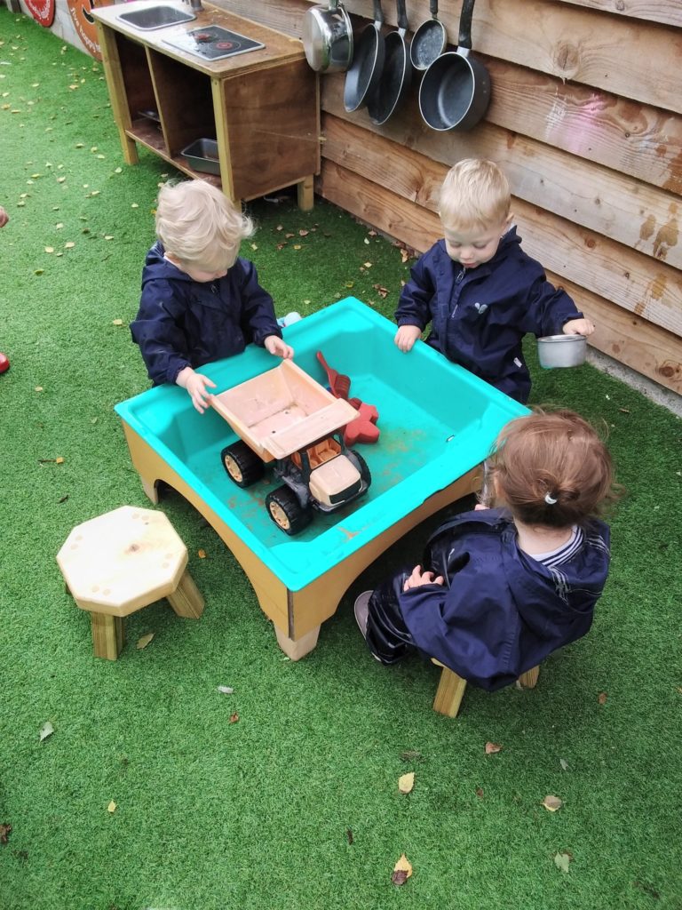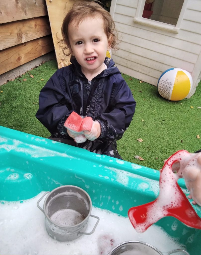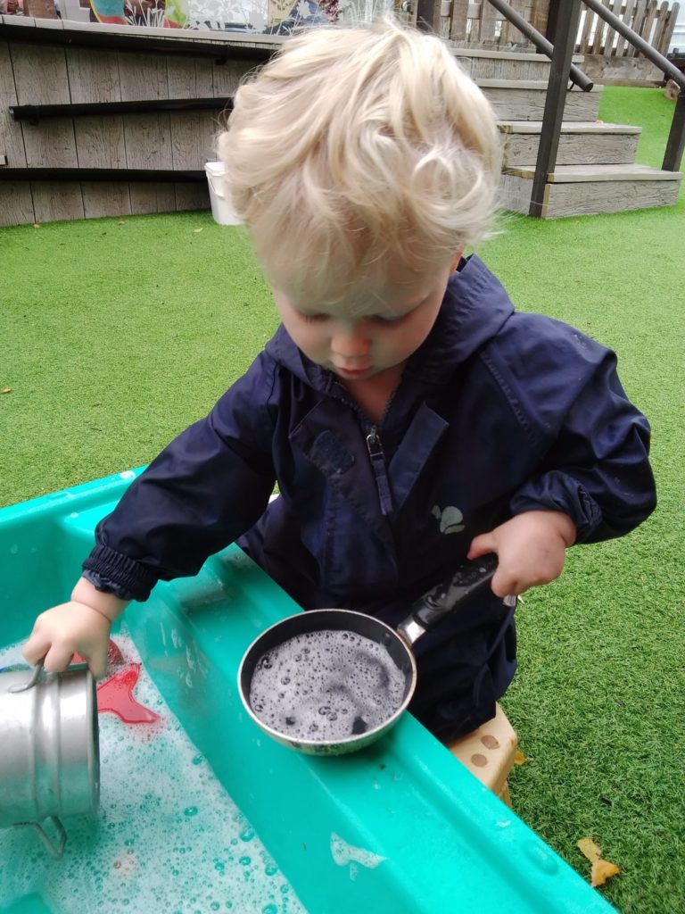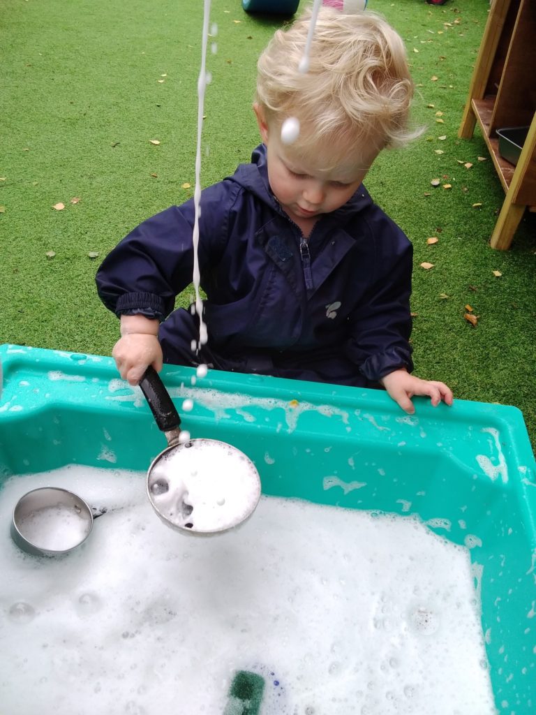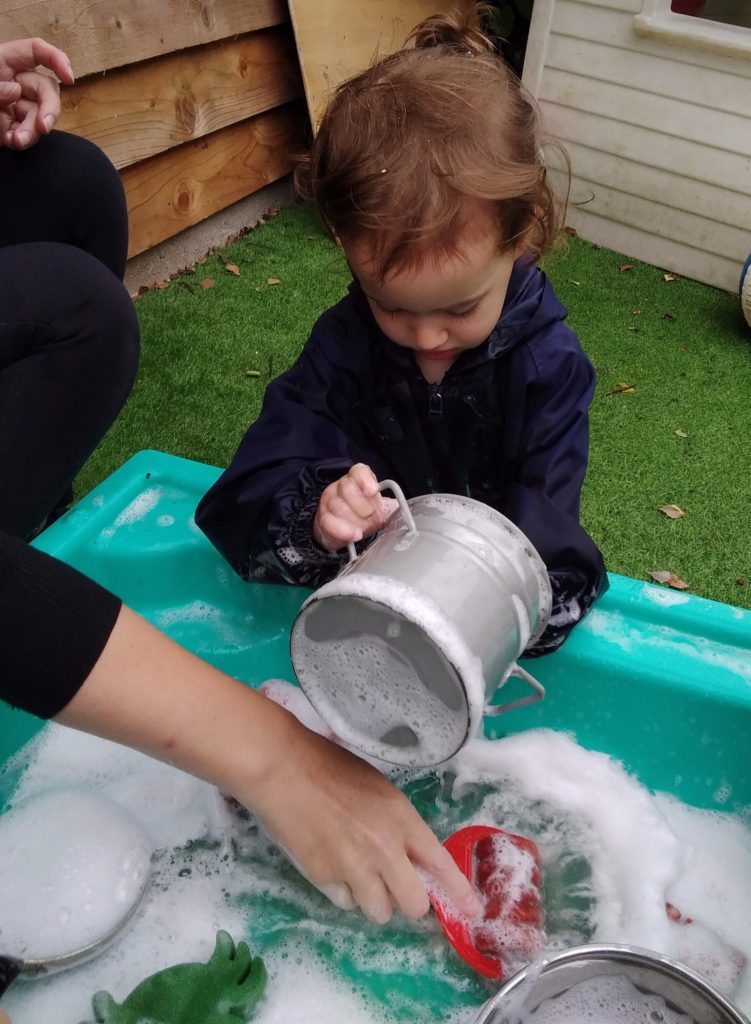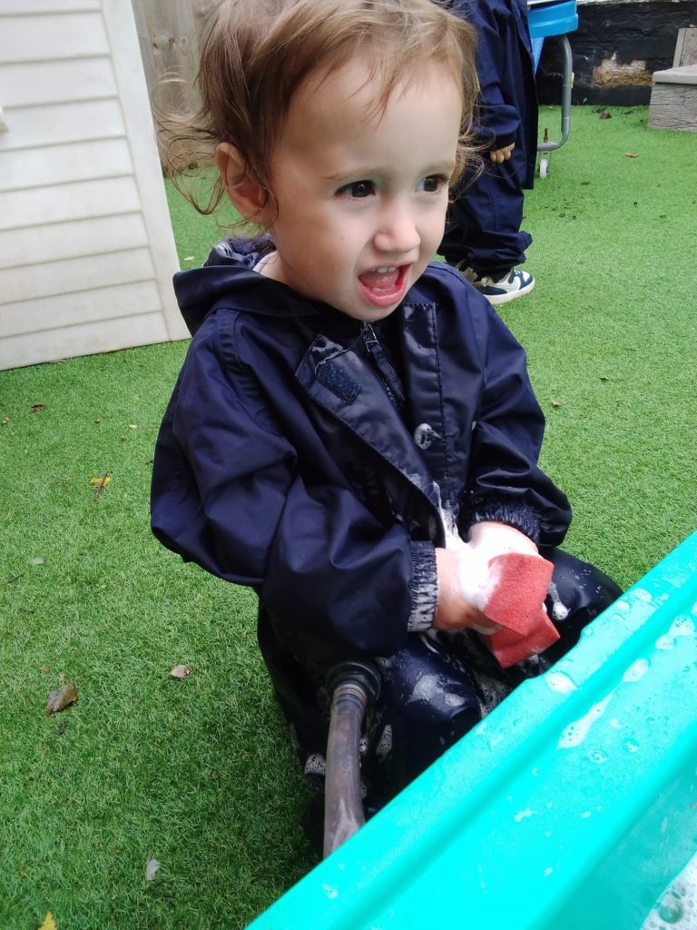 Taking it in turns to find a stool to sit on, the children explored the water, making lots of splashing and swirling movements as they used their hands, sponges, pots and pans to move the water around. The children were also busy helping to clean the toy trucks. They used a variety of sponges for this which encouraged squeezing movements. The Bobtails loved watching the water fall from the sponges and swishing all the bubbles around.