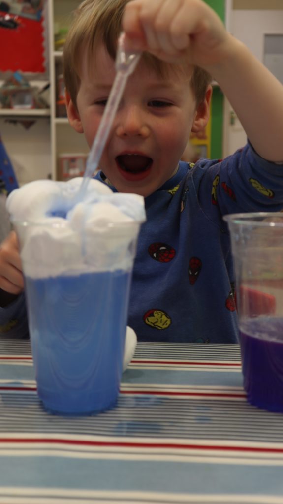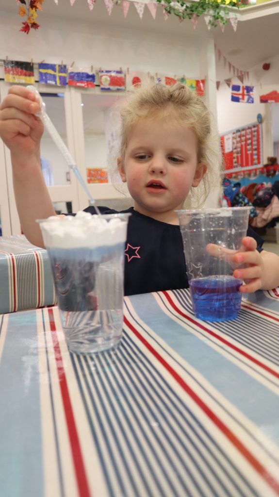 A raincloud in a cup: The children poured water into one cup which represented the sky. Then they squirted foam on top of the water (sky) and the foam represented the clouds in the sky. The children were given another cup filled with blue coloured water to represent the rain which they pipetted on top of the cloud. Eventually the cloud became full and heavy, and the blue rainwater seeped through the cloud which burst causing it to ‘rain’!