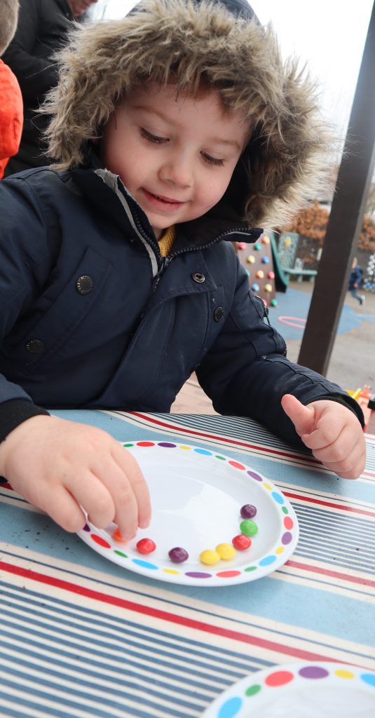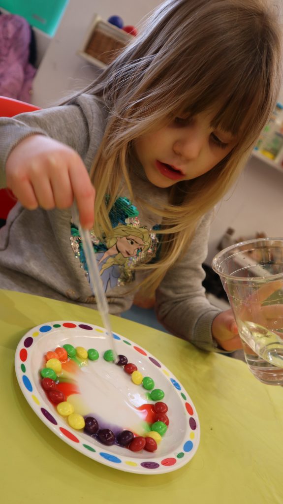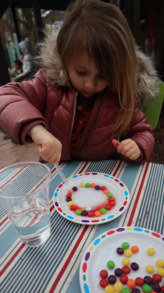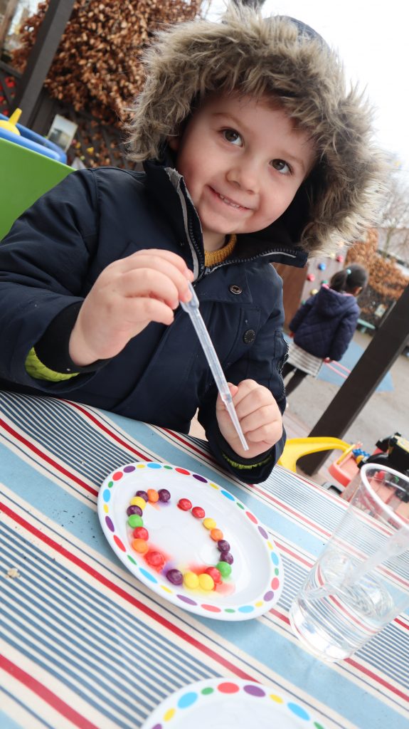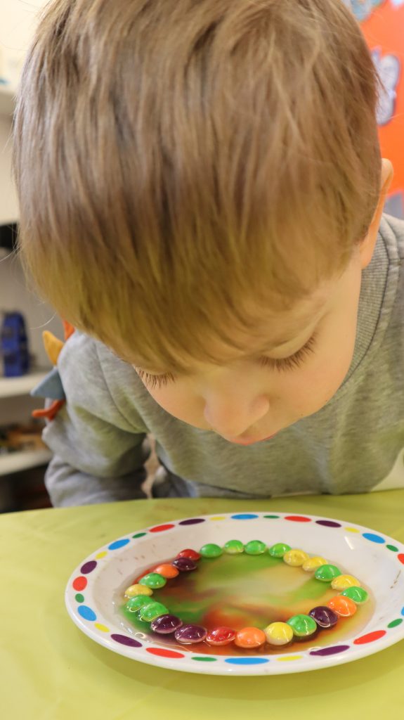 Finding out about dissolving: The ‘Skittles’ experiment was a firm favourite. After carefully arranging the Skittles in a circle on a plate and adding warm water to the centre, the children sat back and watched the magic happen. The coloured sugar coating slowly dissolved and spread through the water to make an amazing Skittles rainbow.