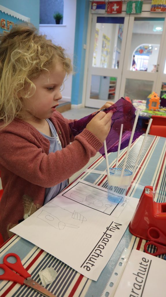 Designing and making egg parachutes: The children selected the materials they would like for their parachute, drew a picture of what they would like it to look like and then constructed the parachute using their ideas. They practised dropping their parachute with a foil egg so they could see whether any alterations needed to be made to their design. Once they were ready for launch, they made their way to the bridge where they took it in turns to release their parachute. Amazingly not one egg broke!