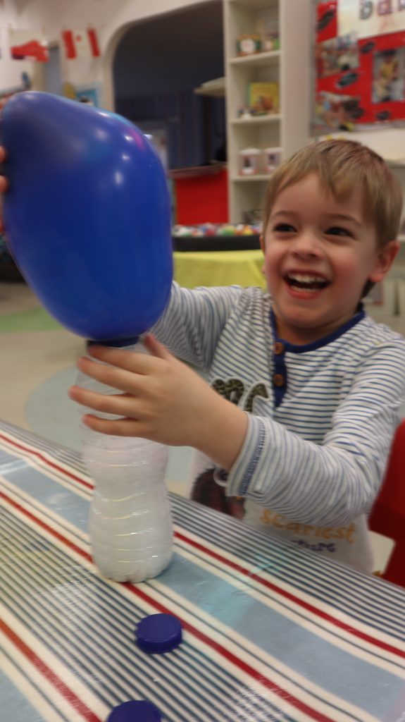 Bottle and Balloon Experiment: The children poured vinegar through a funnel into a bottle. They then placed a funnel inside a balloon into which they spooned baking powder. The balloon was placed over the top of the bottle rim, causing the baking soda to drop into the vinegar. They watched the chemical reactions which caused the balloon to inflate!