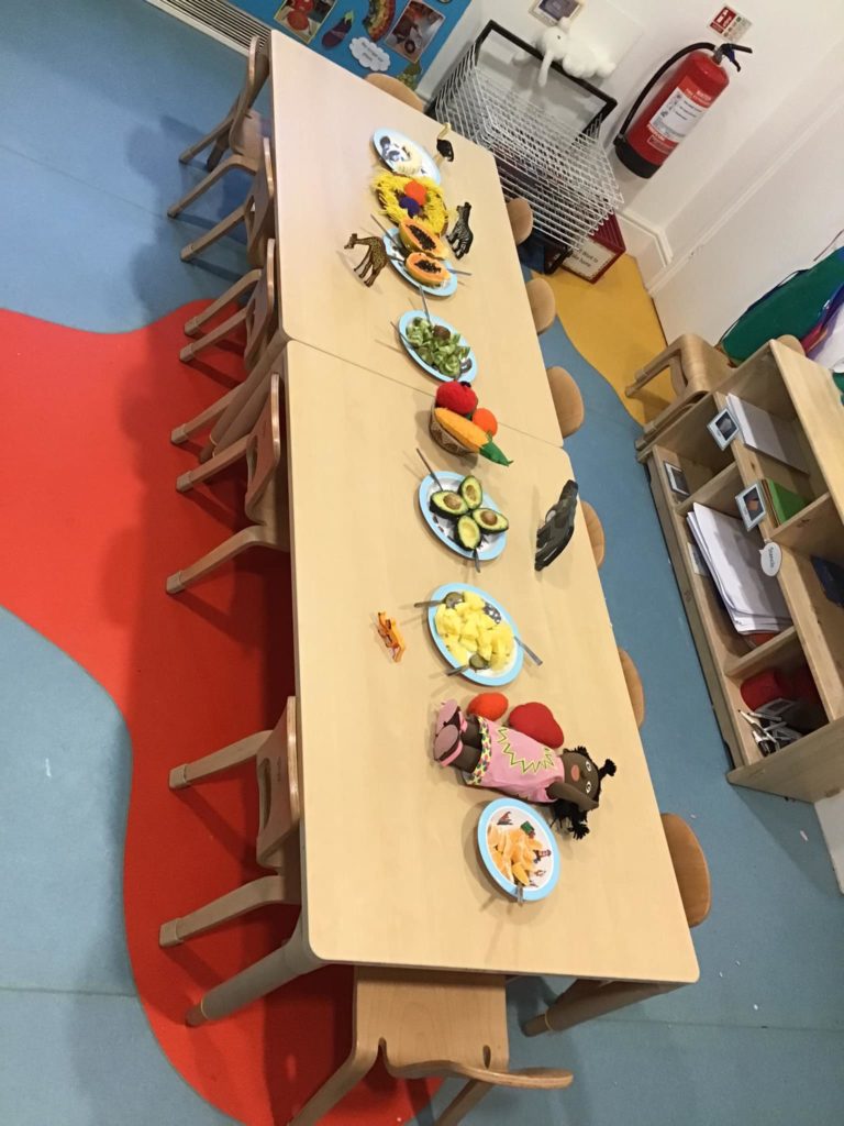 They also enjoyed identifying the various fruits from the Handa’s Surprise story sack and matching them with the real fruits on the table. This led us on to talking about the animals in the story. The children used the fruit and the animals as props when they retold the story.