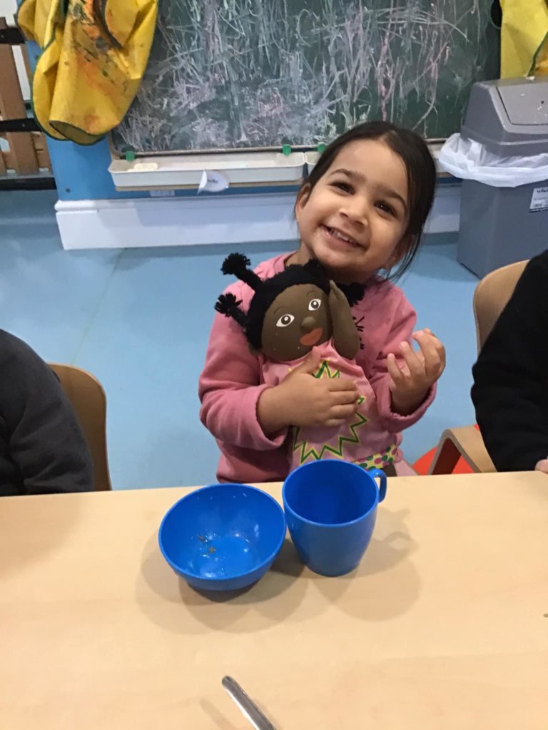 Our book of the month is Handa’s Surprise by Eileen Browne which tells the tale of what happens when Handa, who lives in an African village, sets off with a basket of seven delicious fruits, one for each of her friends. She’s unaware that some crafty animals are intent on stealing the fruit. The story fills the children with anticipation as the fruits disappear.