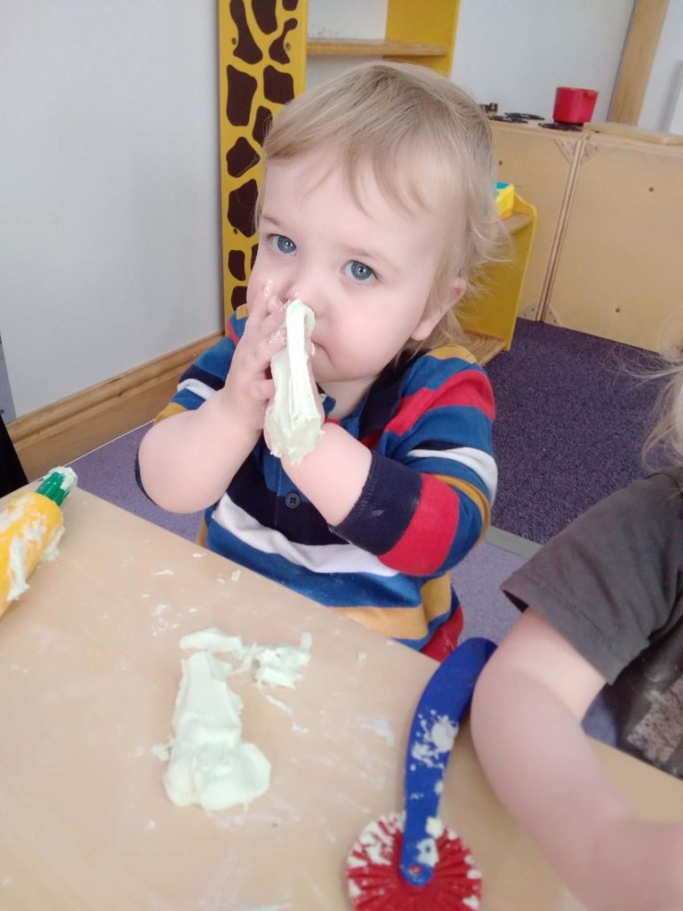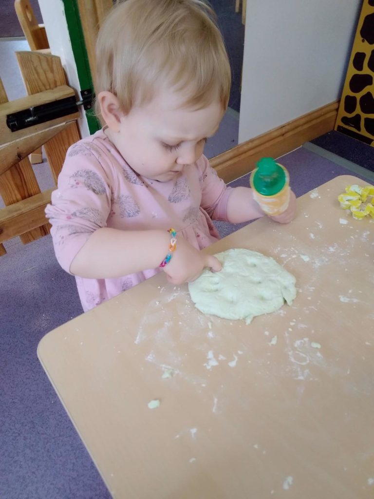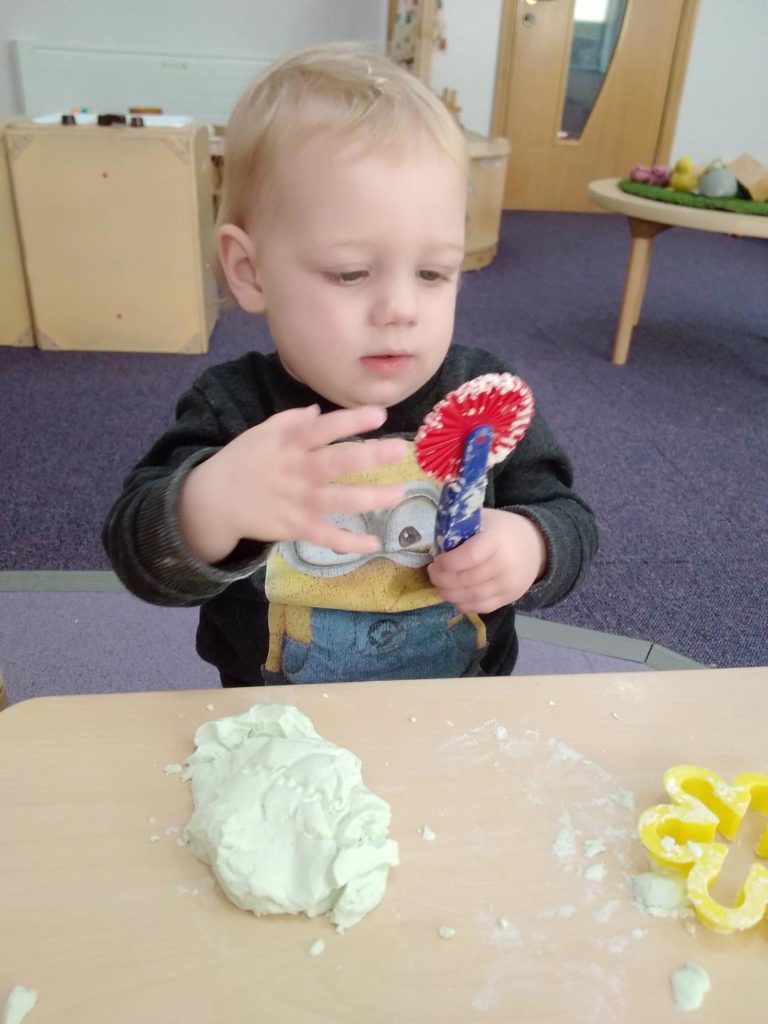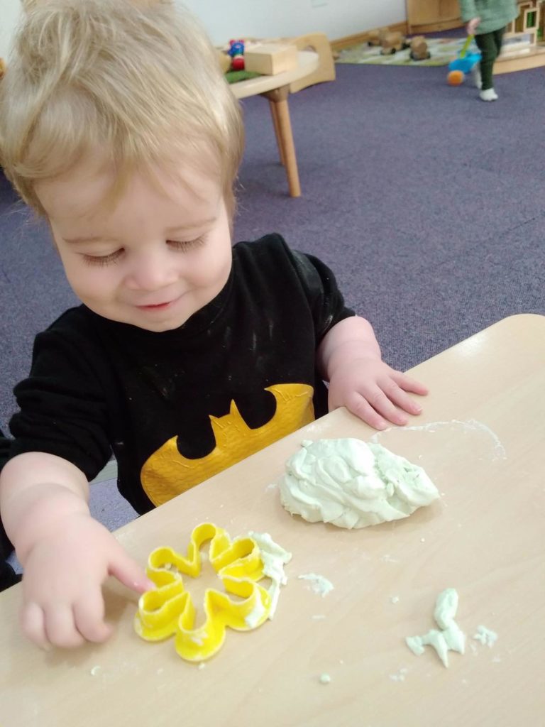 They went on to use the cloud dough made by Miss Emily which was a lovely tactile experience. The children used their senses of touch and smell when exploring the texture of the dough and discovering what they could do with it. After using just their hands to kneed, shape and prod the dough, the activity was extended by giving the children an assortment of utensils with which to manipulate the cloud dough.