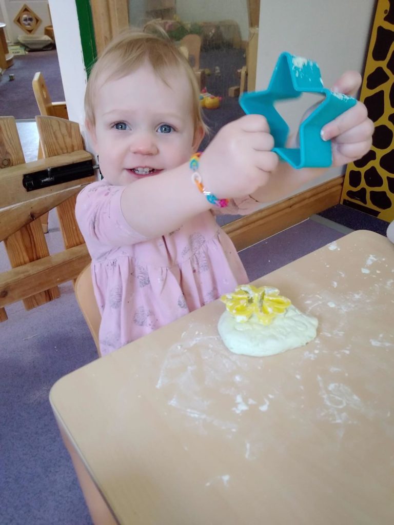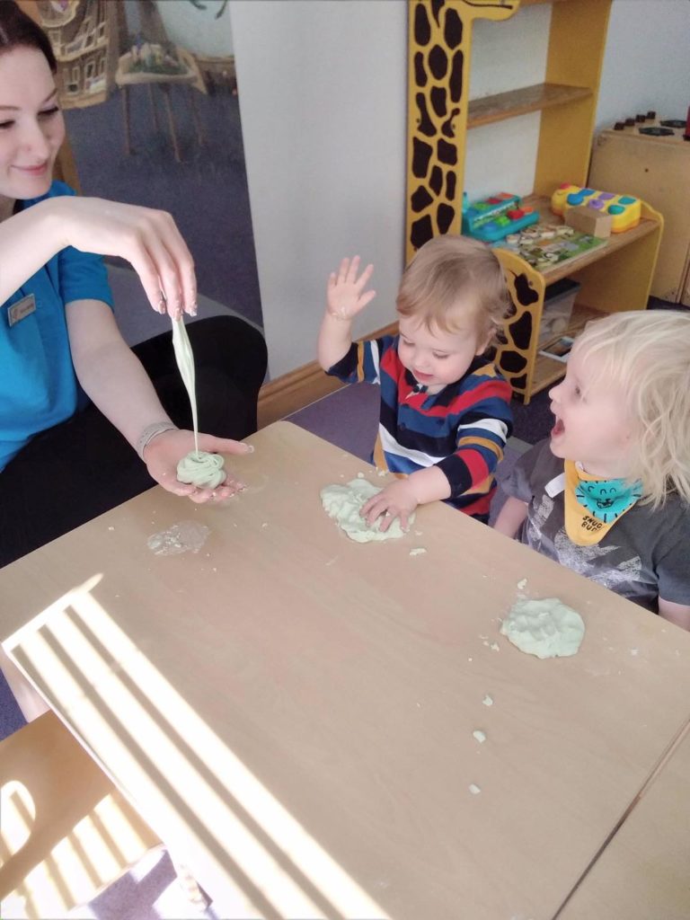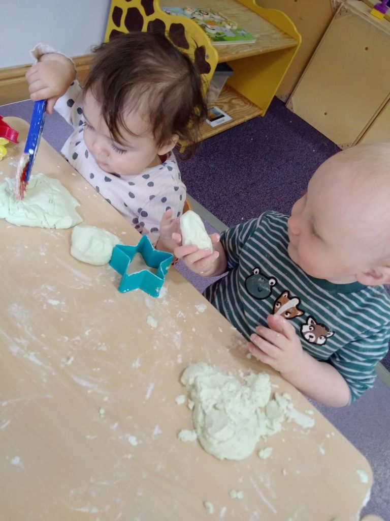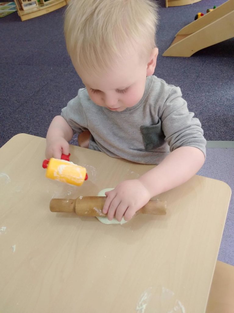 They went on to use the cloud dough made by Miss Emily which was a lovely tactile experience. The children used their senses of touch and smell when exploring the texture of the dough and discovering what they could do with it. After using just their hands to kneed, shape and prod the dough, the activity was extended by giving the children an assortment of utensils with which to manipulate the cloud dough.