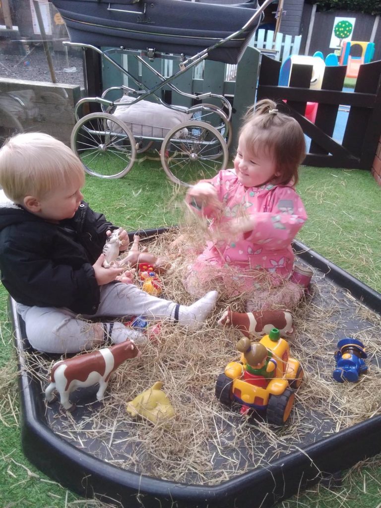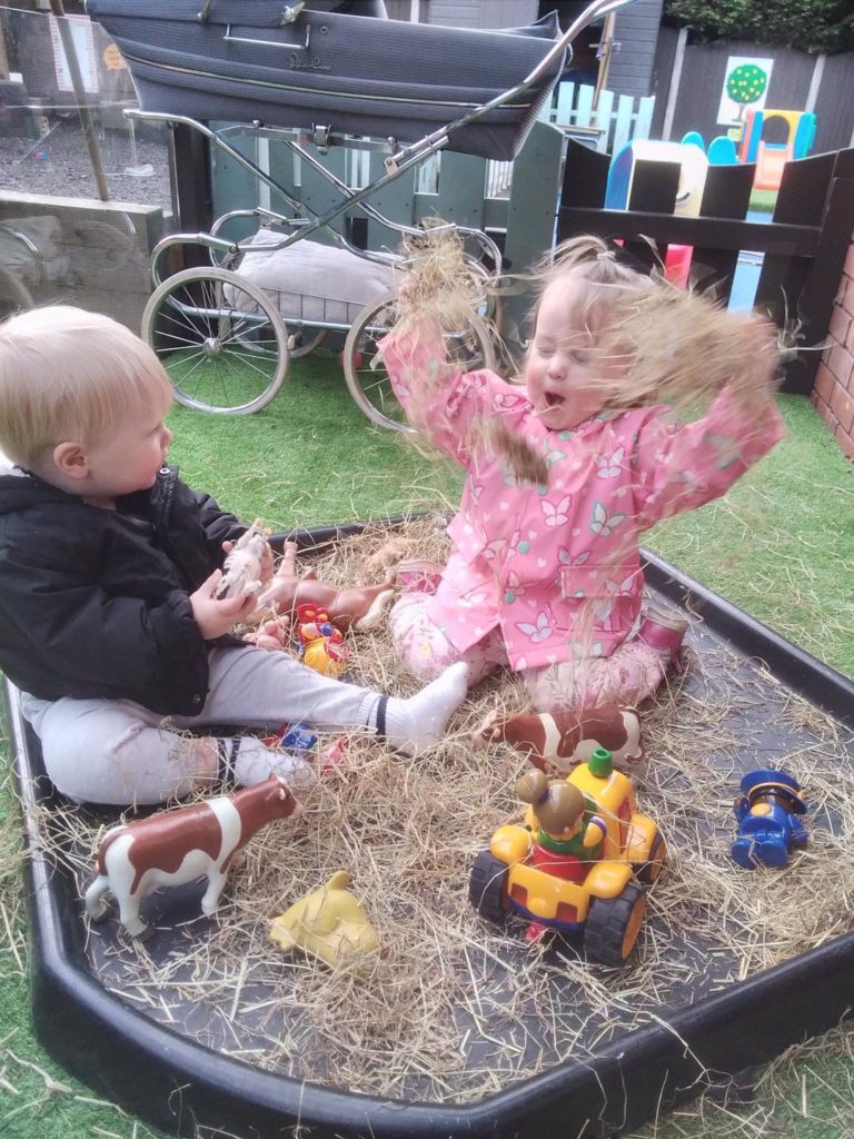 Our under 2s have been finding out about farm animals, learning animal names and their sounds. They also experienced the texture of hay and showed so much excitement when throwing it up into the air. Such fun!