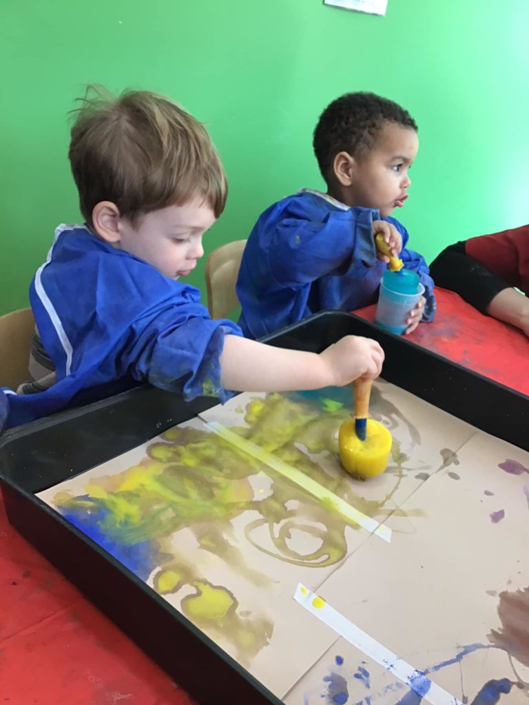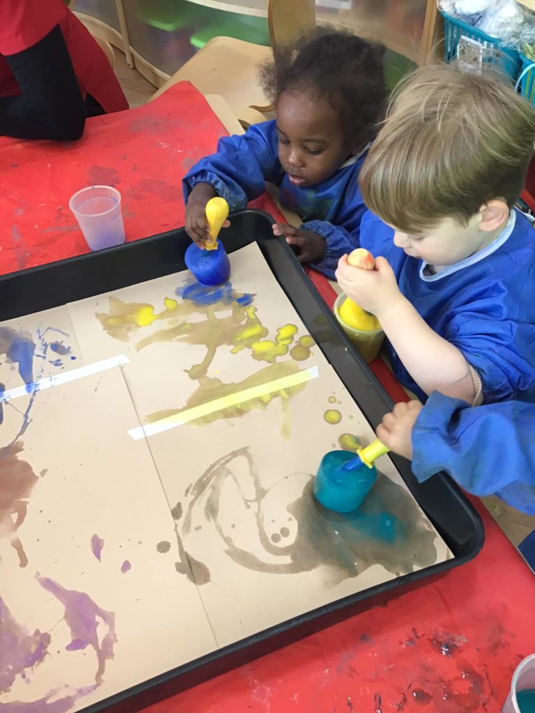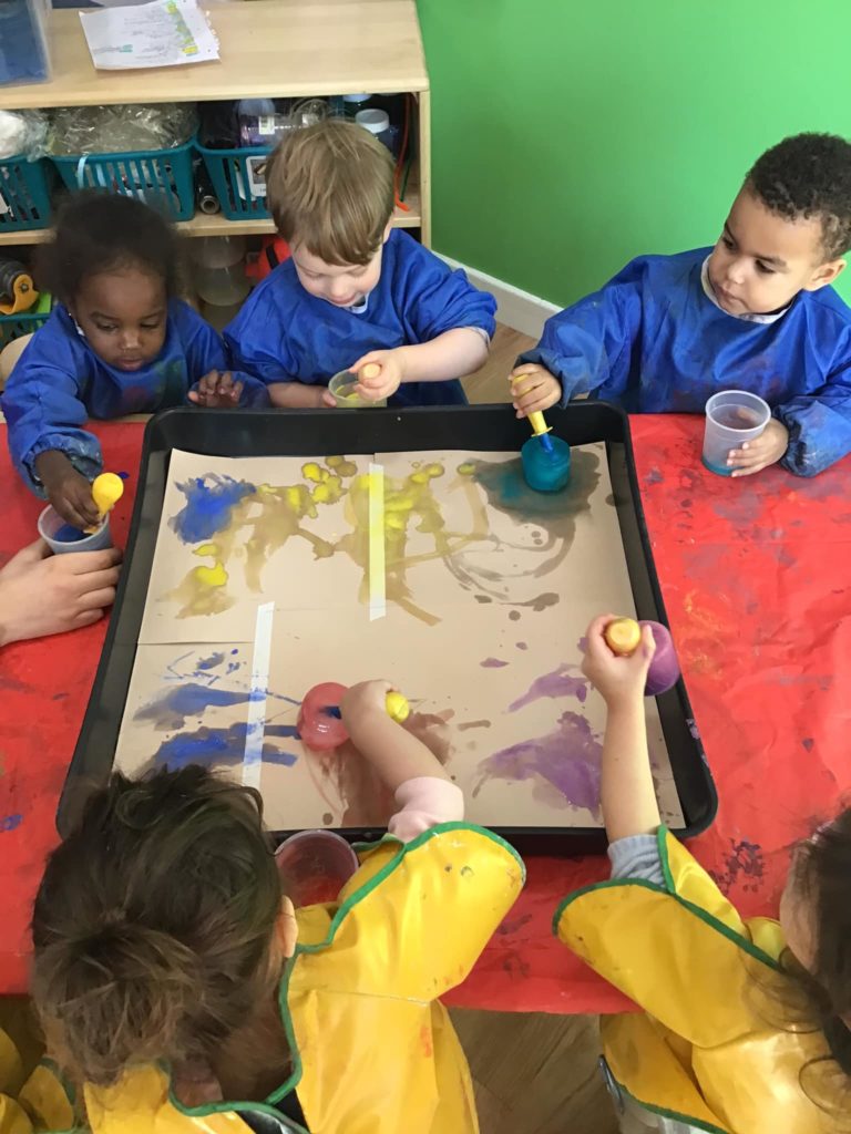 Meanwhile, the Peter Rabbits loved exploring their senses by doing some ice painting in the tuff spot. They used the paint brushes to move the ice around on the paper and enjoyed watching the marks they were making!