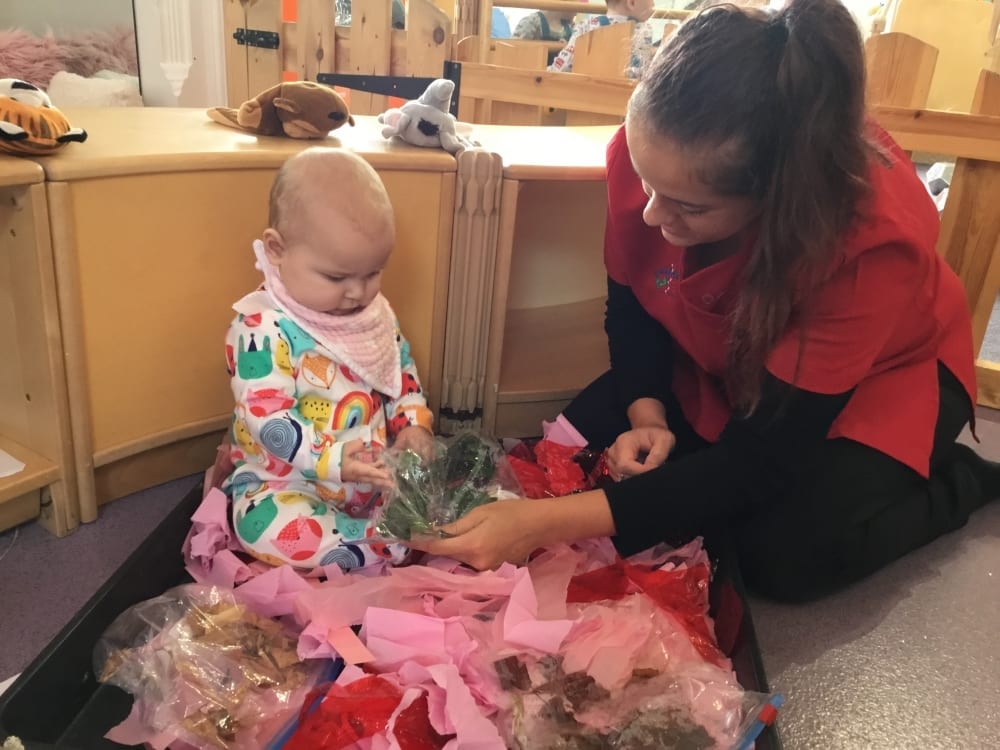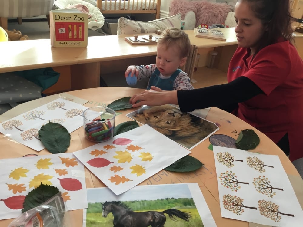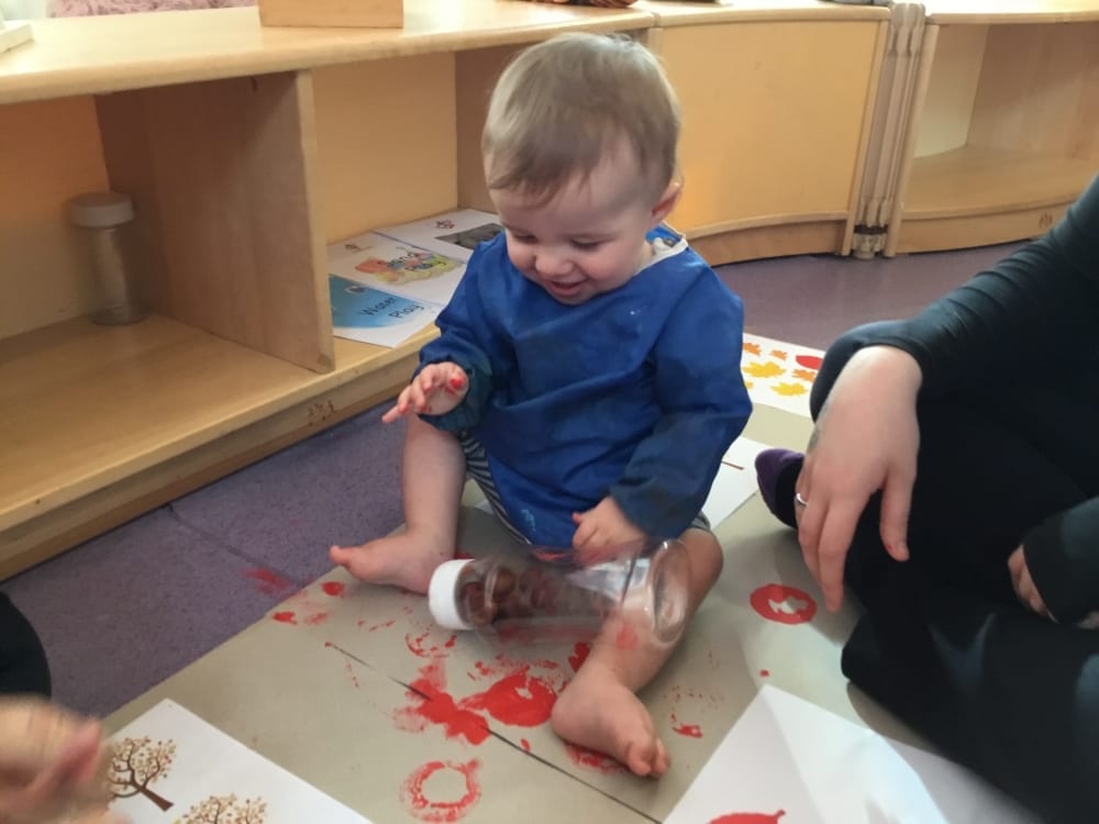 Our little ones have been enjoying the lovely Autumn weather! We’ve brought Autumn inside filling our sensory bags with crunchy Autumn leaves, looking at the wonderful seasonal colours and painting pictures. Shaking the glitter over the leaves and shaking conkers in a jar was great fun!