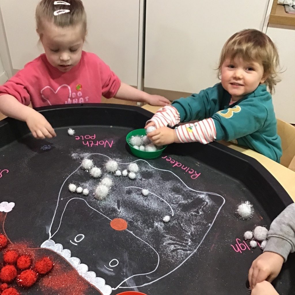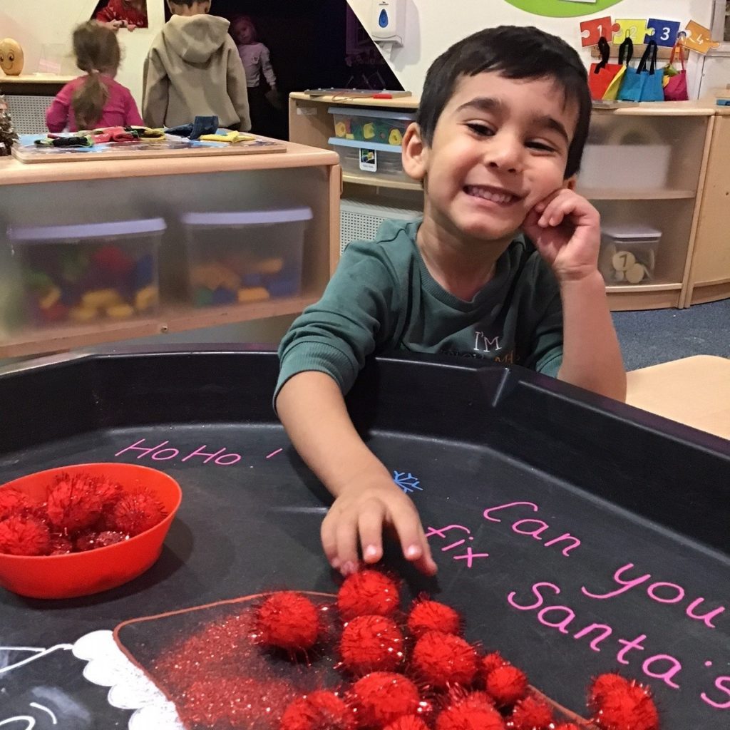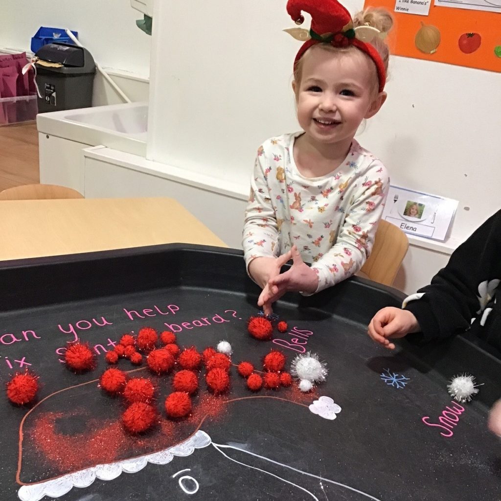 They’ve enjoyed using their fine motor skills to create Santa’s beard and hat. They looked at different colours, used their counting skills and created patterns with the pom poms.