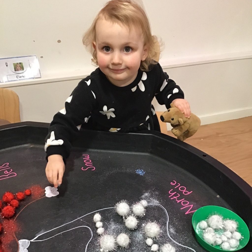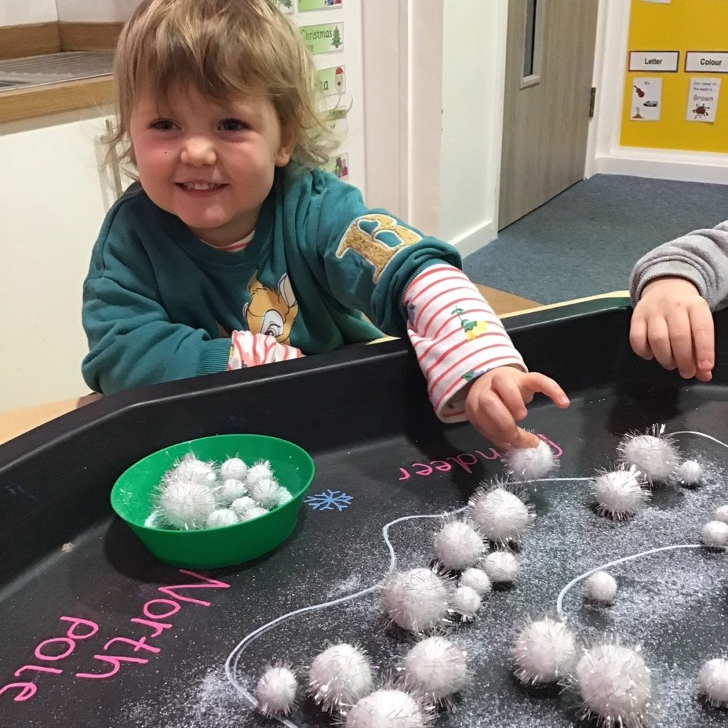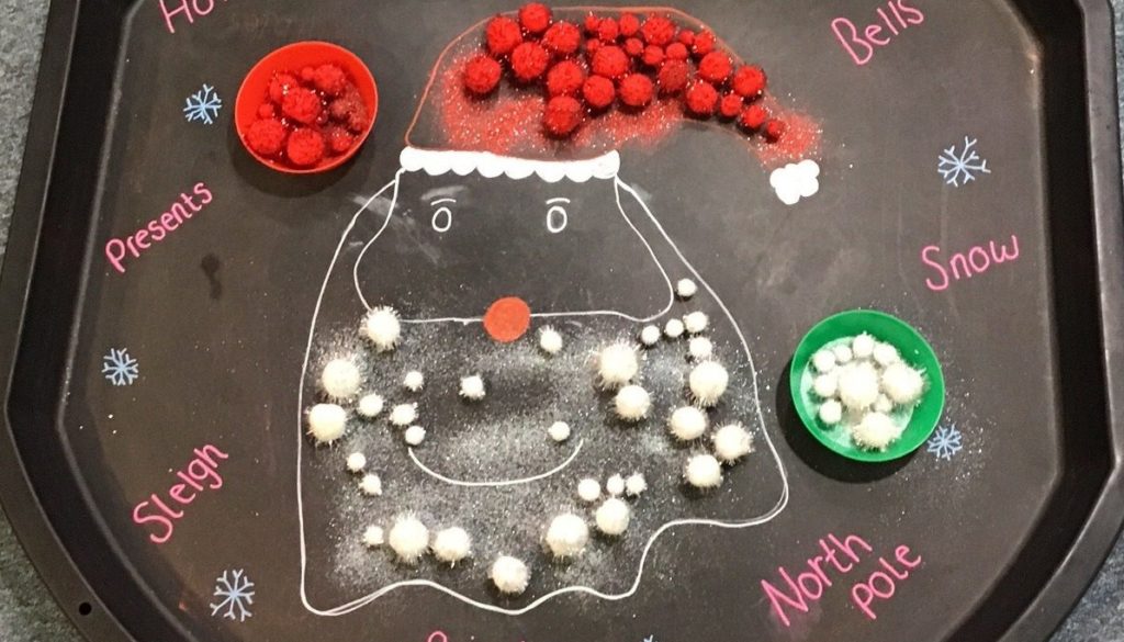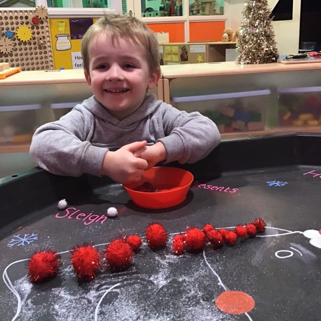 They’ve enjoyed using their fine motor skills to create Santa’s beard and hat. They looked at different colours, used their counting skills and created patterns with the pom poms.