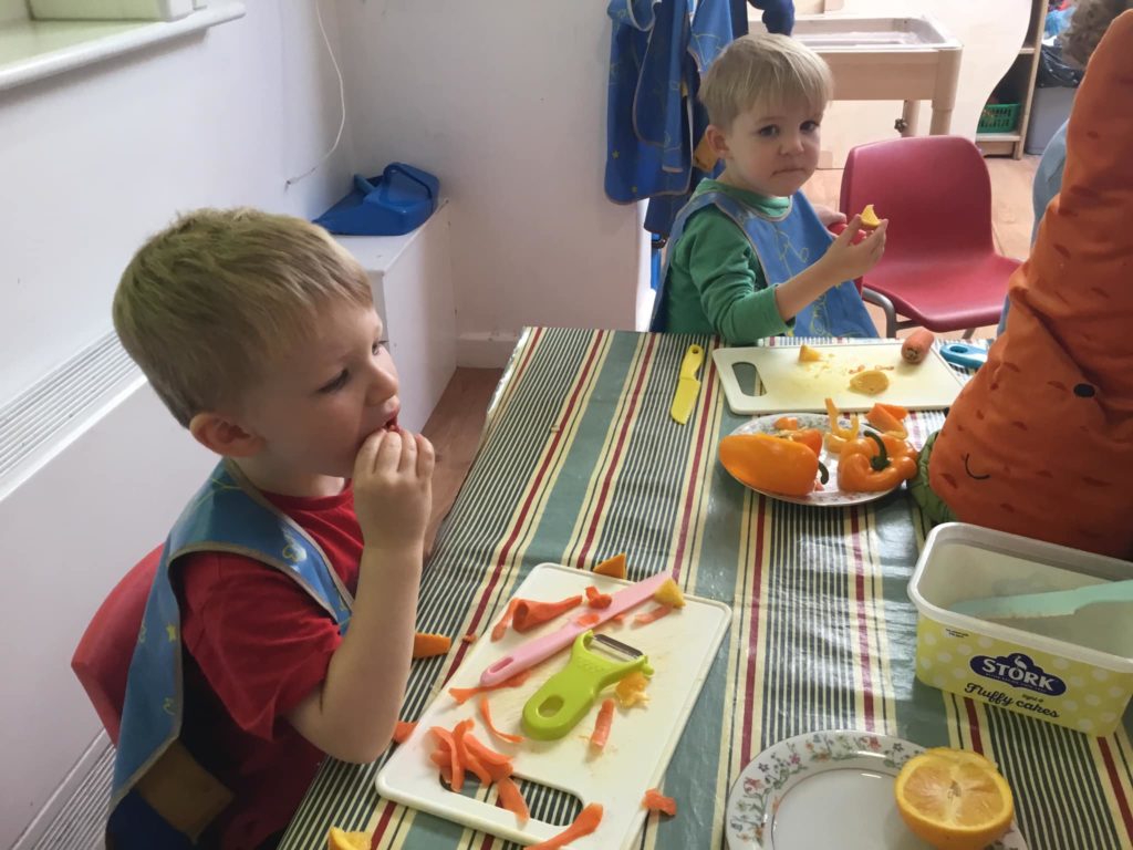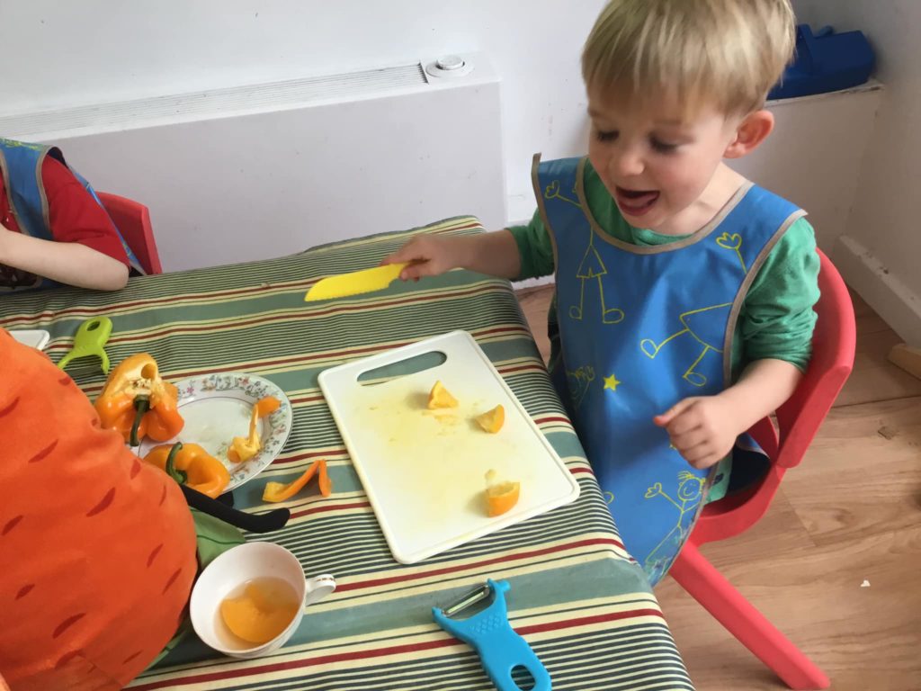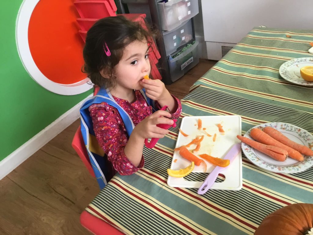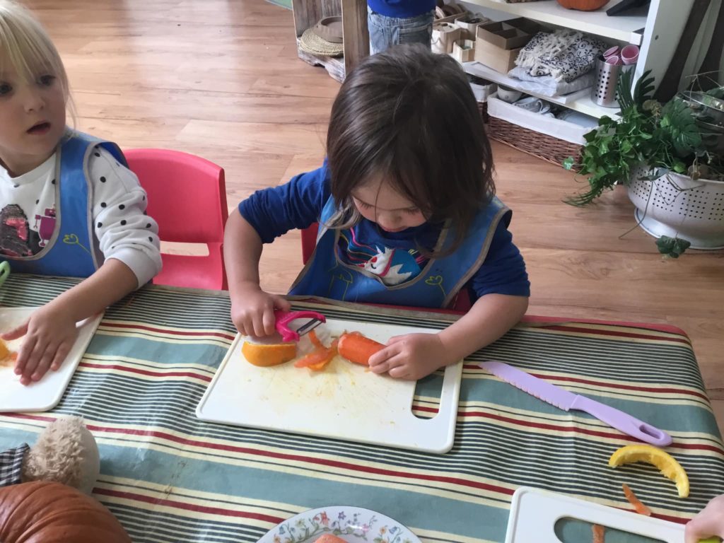 As well as developing our peeling, chopping, and cutting skills, we have also tried many different foods such as peppers, oranges, carrots, apricots, peaches and even raw pumpkin! What other orange foods you can think of?