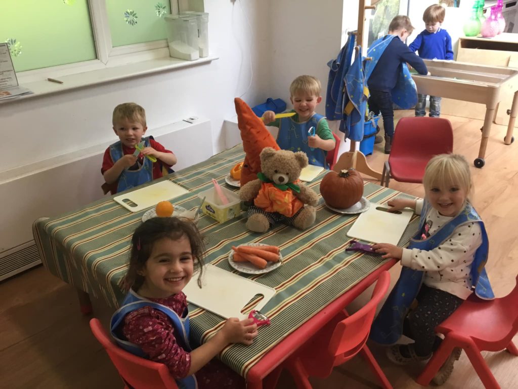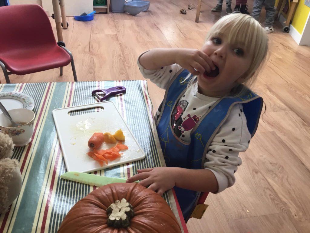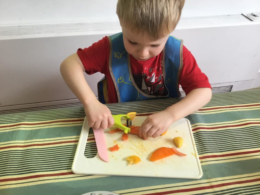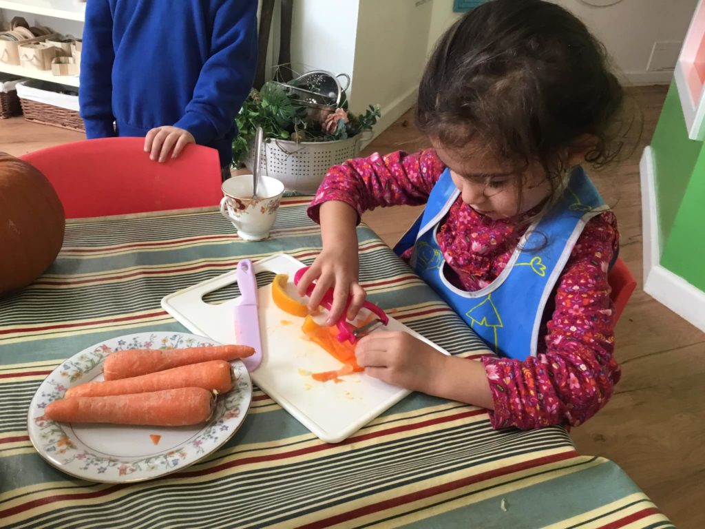 As well as developing our peeling, chopping, and cutting skills, we have also tried many different foods such as peppers, oranges, carrots, apricots, peaches and even raw pumpkin! What other orange foods you can think of?