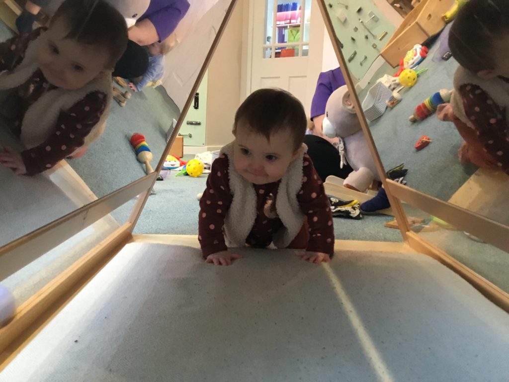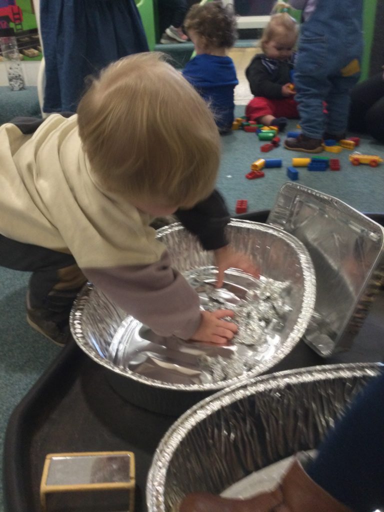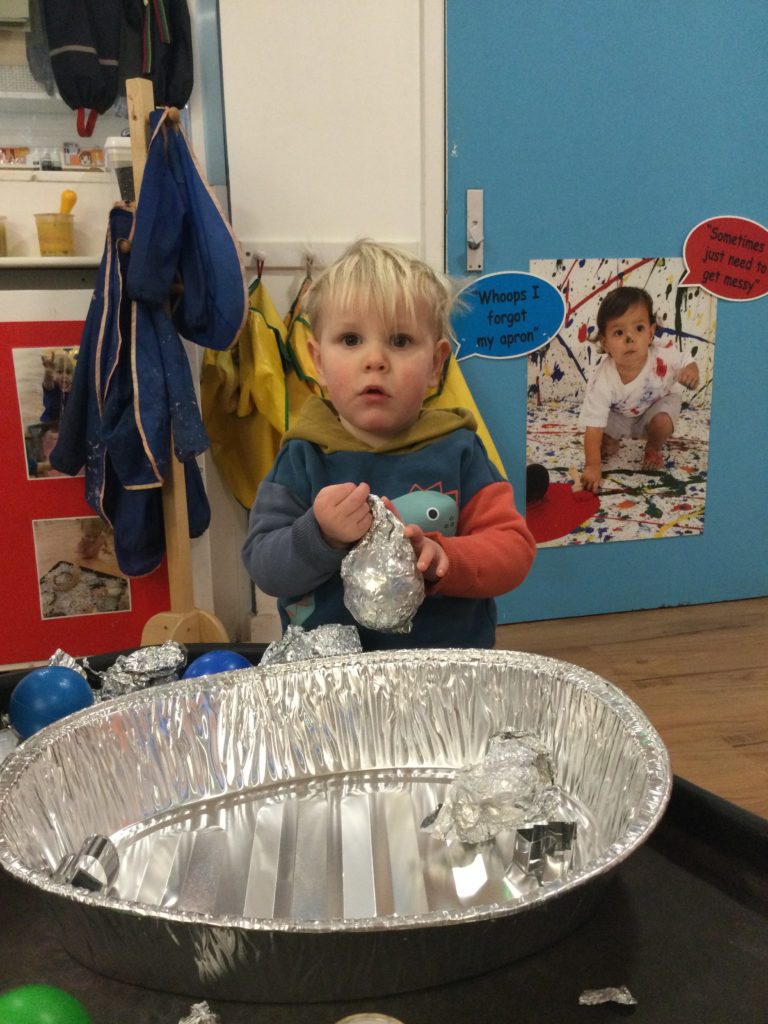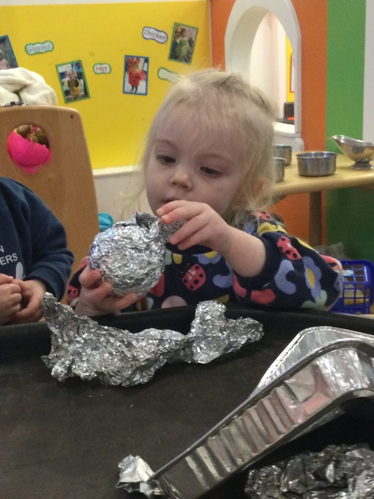 Children in our baby suite have loved exploring shiny and reflective objects recently. They’ve had a great time unwrapping the silver balls and crinkling the foil trays and blankets. With curiosity aroused by the objects, the children used their senses and developed their fine motor skills and language skills as they explored the wonder of the shiny objects.