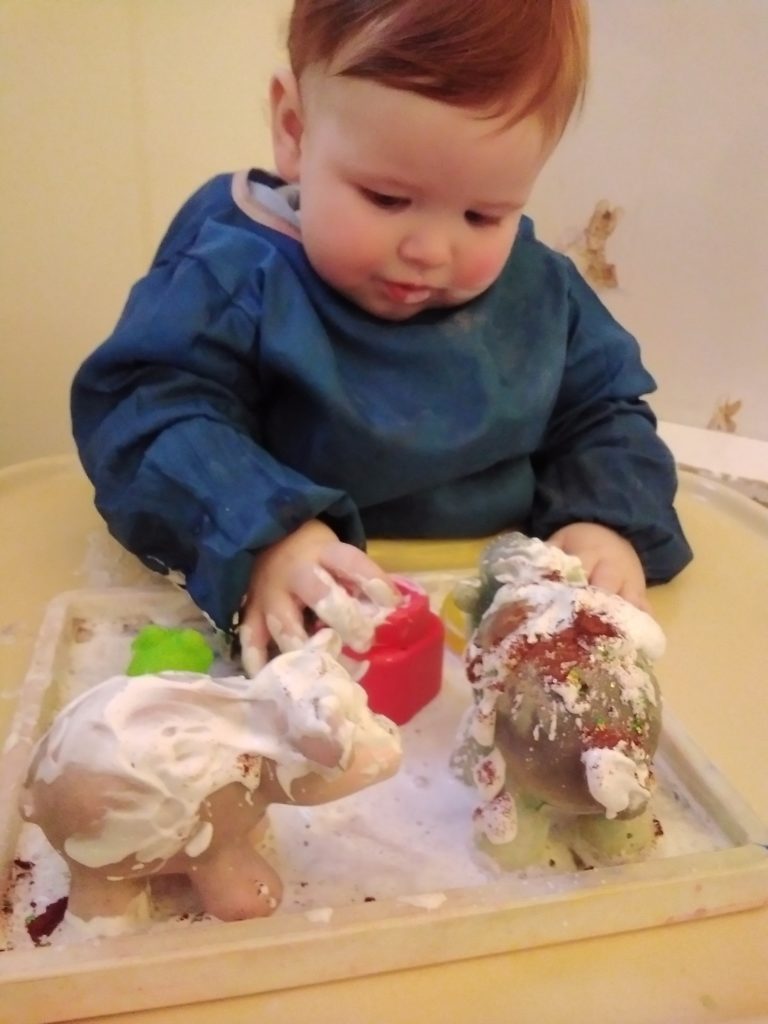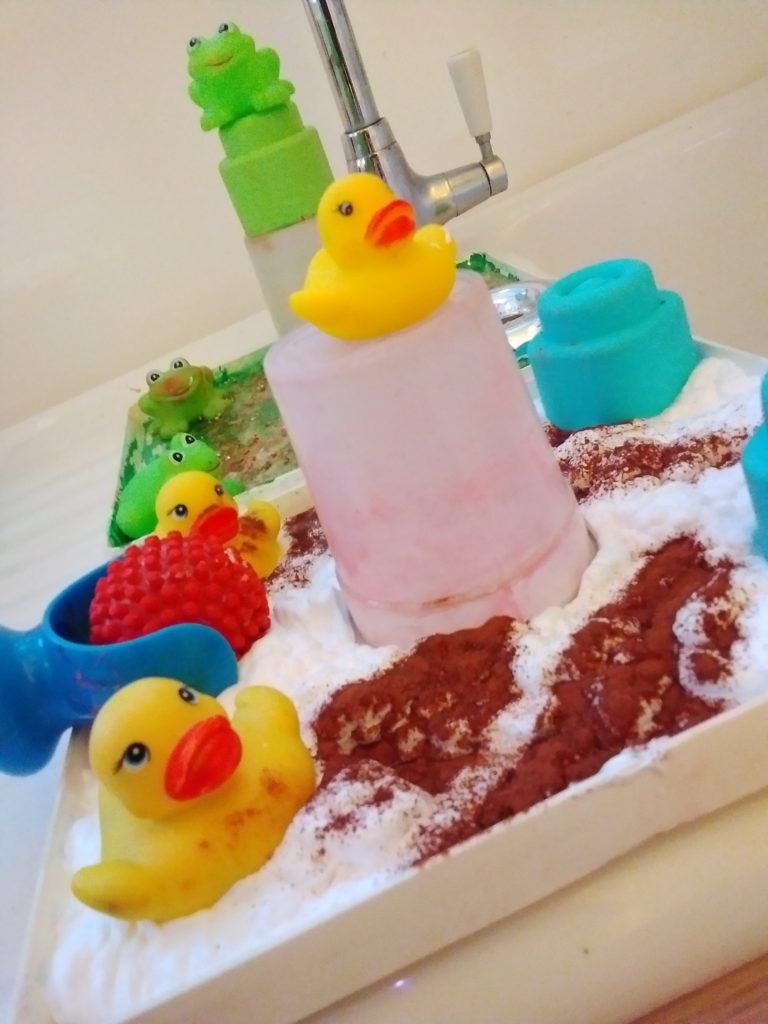 The Jemima Puddleduck’s have also been having fun exploring the cinnamon shaving foam, glittery cinnamon water, ducks, frogs, soft blocks, and pots. The children loved feeling the sensory textures and emptying and filling using the pots.