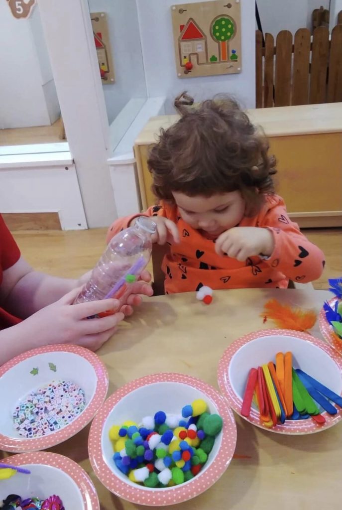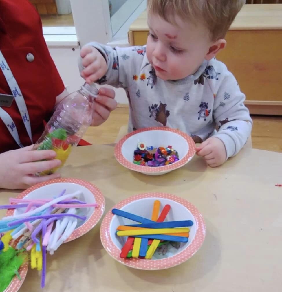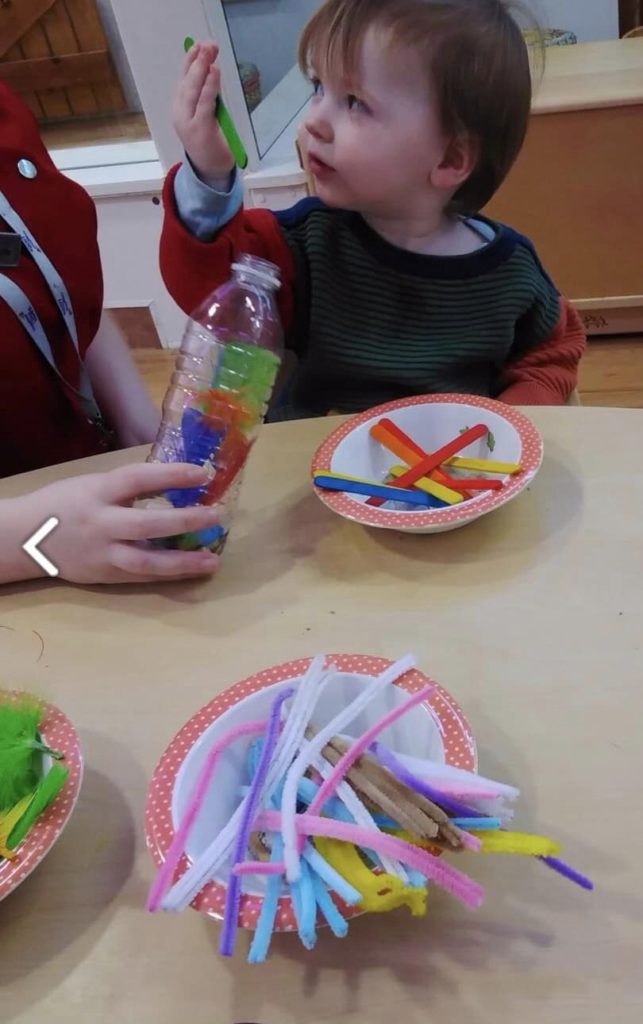 Bobtails have been busy making sensory bottles. We encouraged the children to make their own choice of sensory materials to put into the bottles such as wooden sticks, poms poms and feathers. The Bobtails have been using their motor skills and developing new language such as, wow, look, and pom pom.