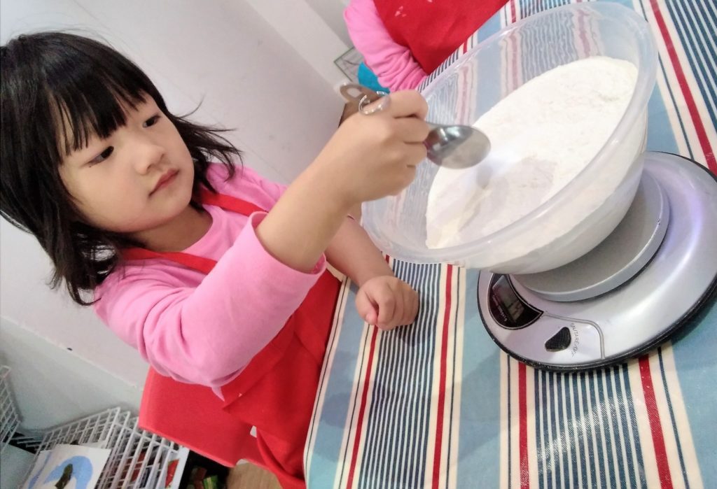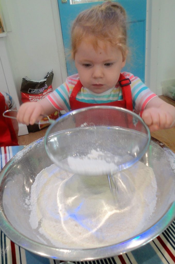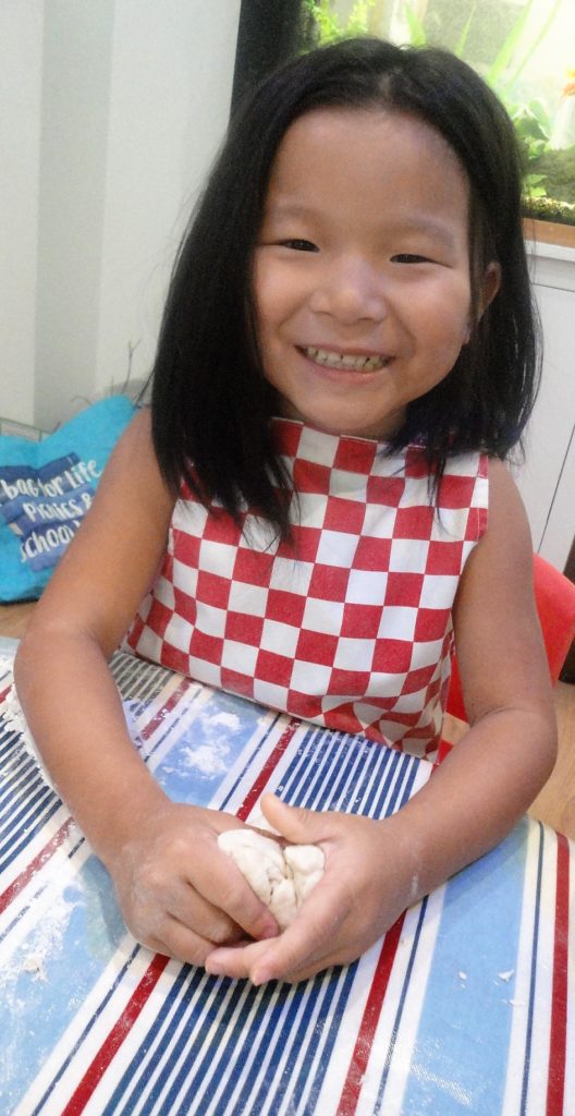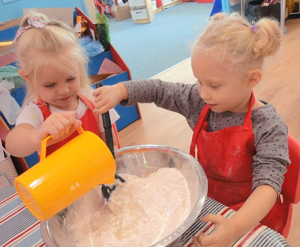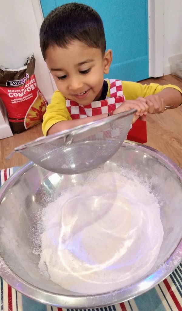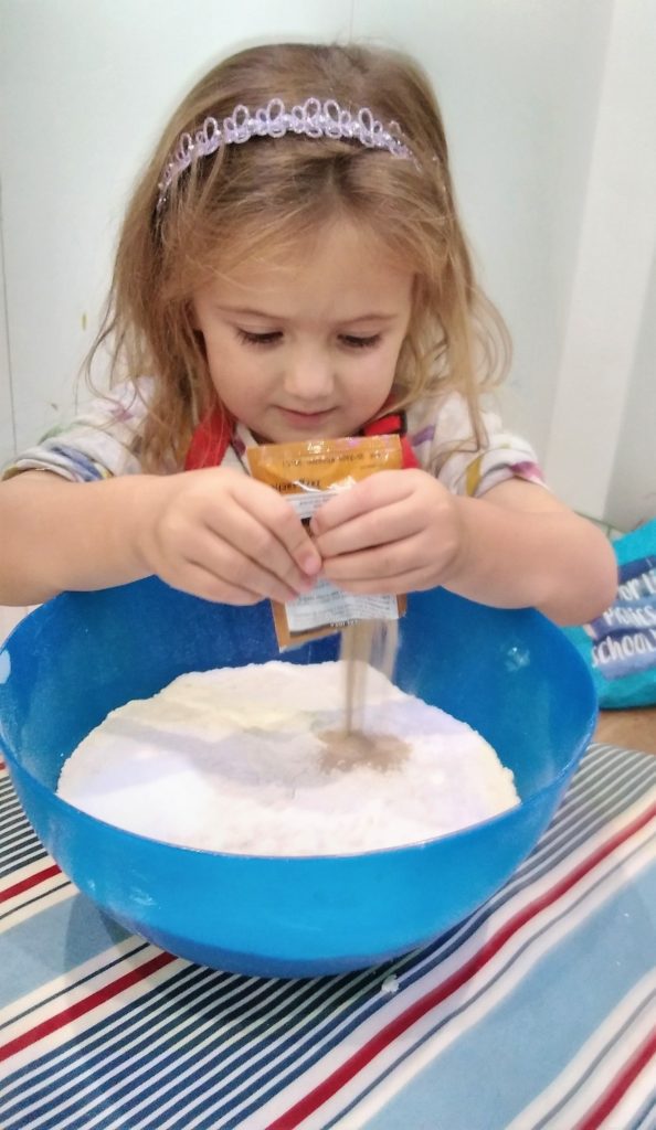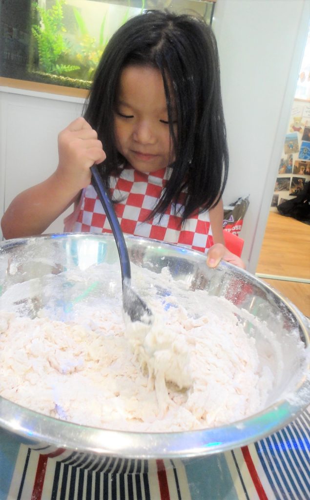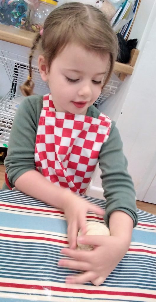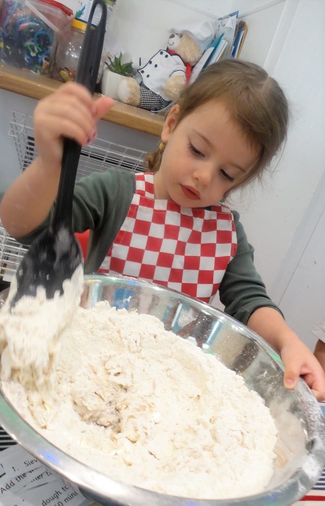 The children were very good at recognising numerals to order the instructions correctly and following the instructions to make the bread. They helped to weigh, pour and mix the ingredients into a dough and showed very good kneading skills. We then left the dough for some time and the children were amazed at how much it had risen!