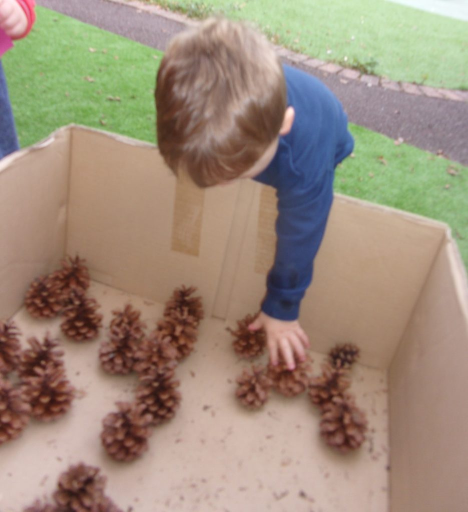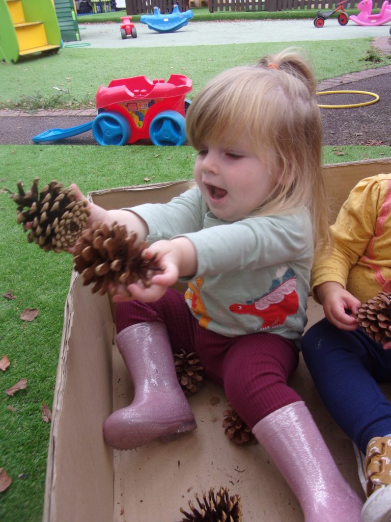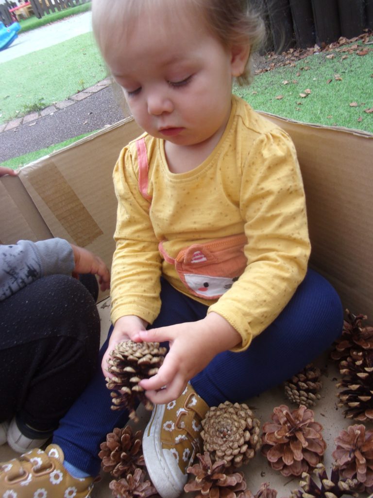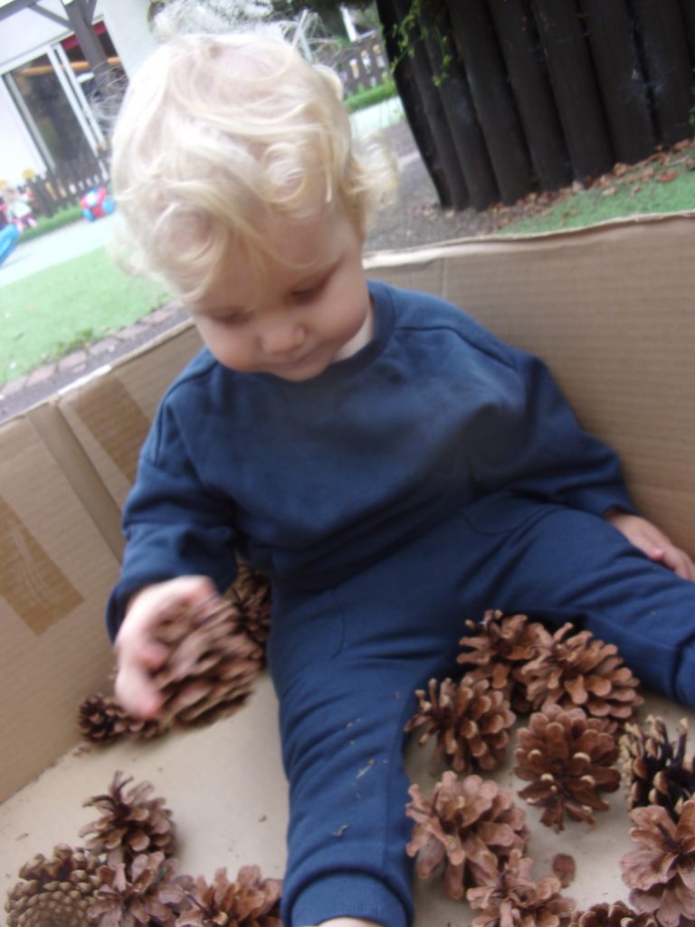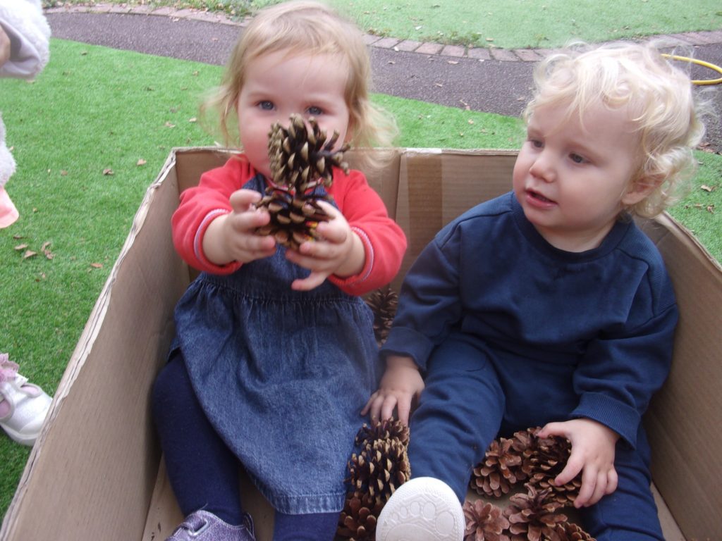 Bobtails were busy discovering what autumn had brought to the garden. They were out and about finding a large number of pine cones which had drifted down from the trees. They found the texture of the cones very interesting as they gathered them up and placed them in our collecting box. Sitting in the box with the cones was great fun too!
