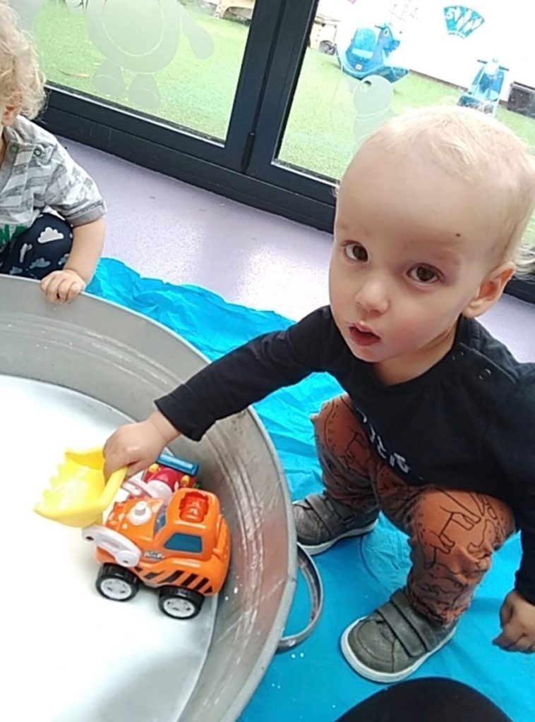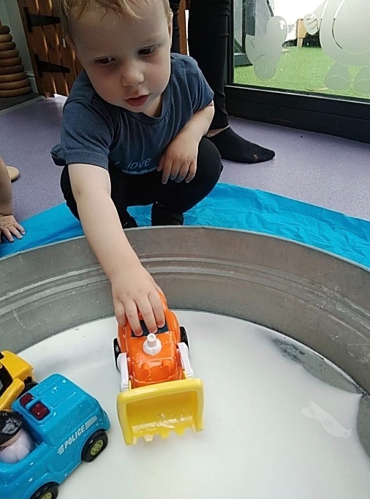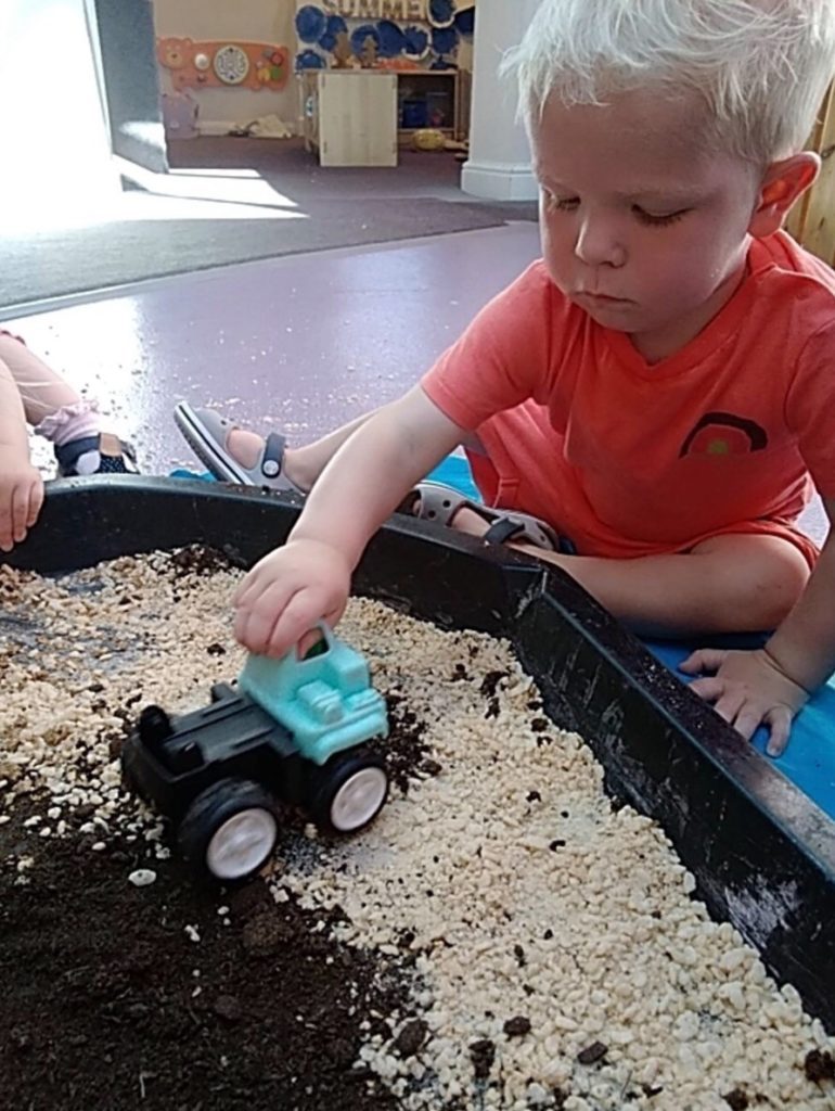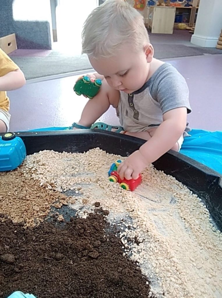 In our Under 2s unit, the children have been using the diggers and cars to explore in different sensory materials. They’ve used the diggers to explore in crushed up rice krispies and mud. The children enjoyed feeling the different textures in the tuff spot!