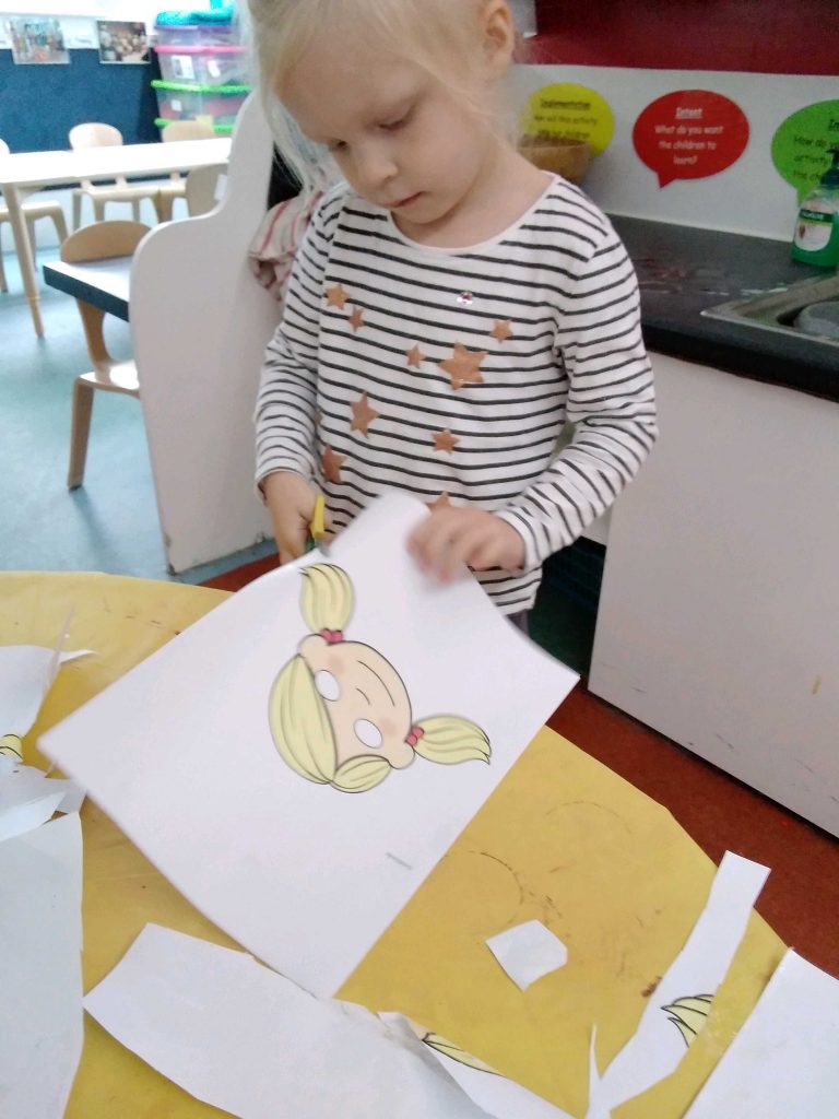 We then practised our scissor skills by cutting out a picture of Goldilocks. We glued on some wool to give her some beautiful golden locks!