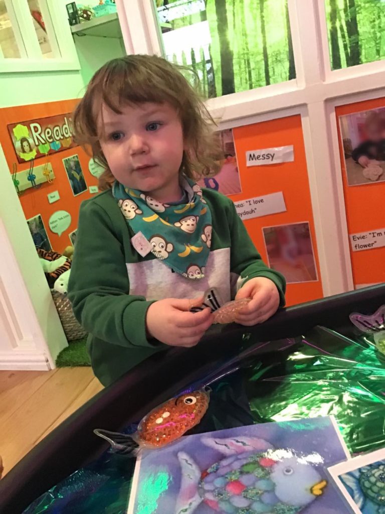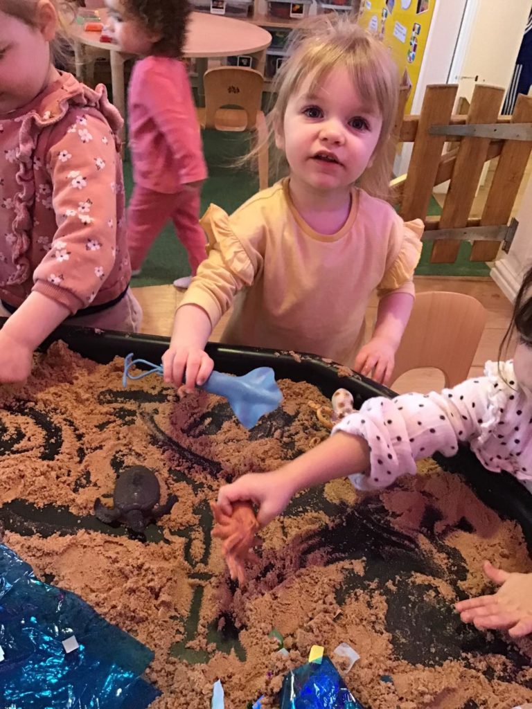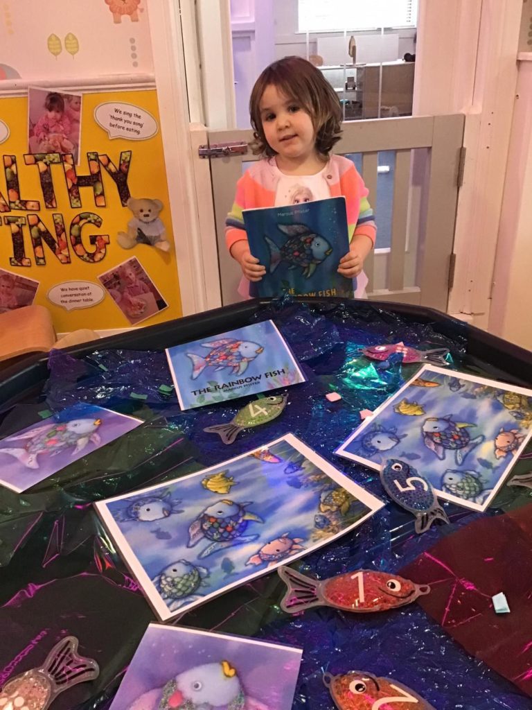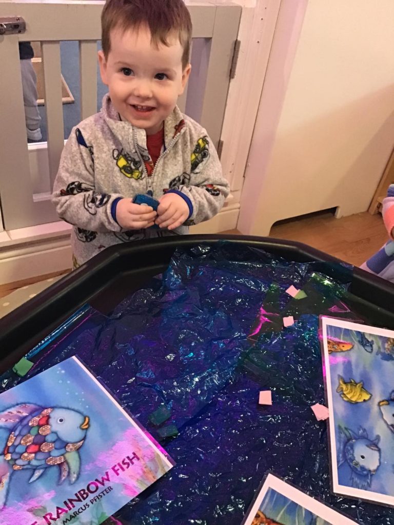 After listening to the story, the Peter Rabbits loved exploring our Rainbow Fish tuff tray! They enjoyed feeling the textures of the bubble fish and the sand. We spoke about all of the gorgeous colours in the book and the various sea creatures in our mini ocean.