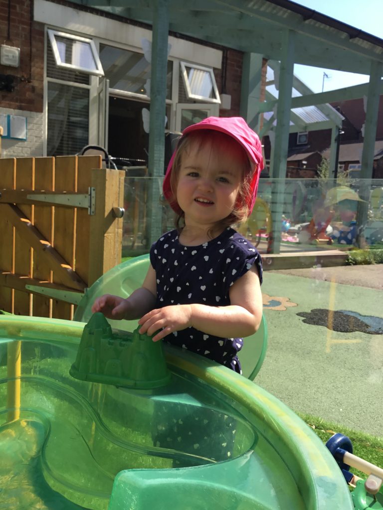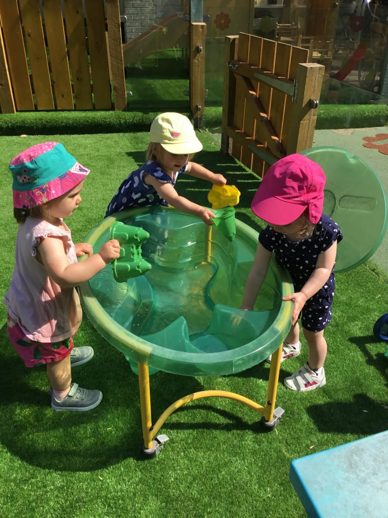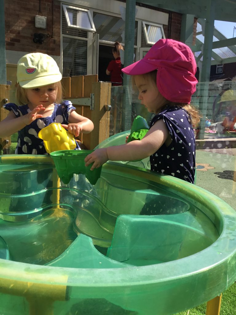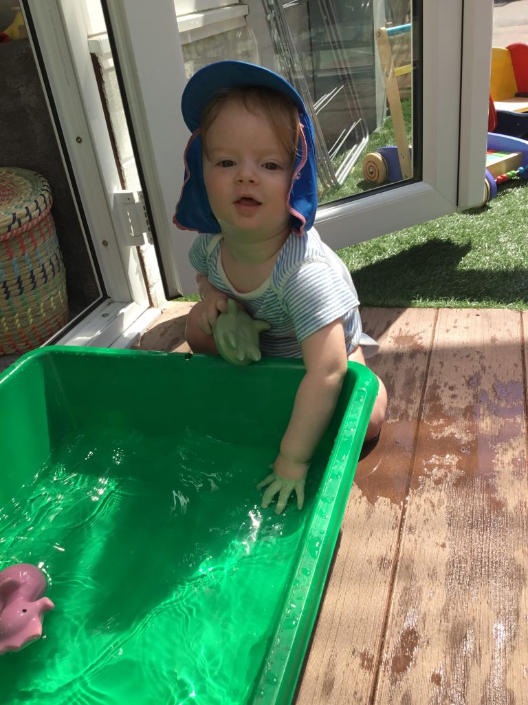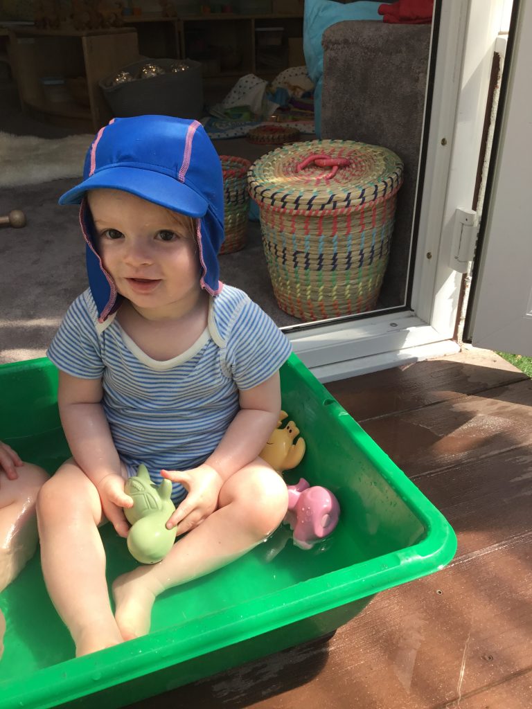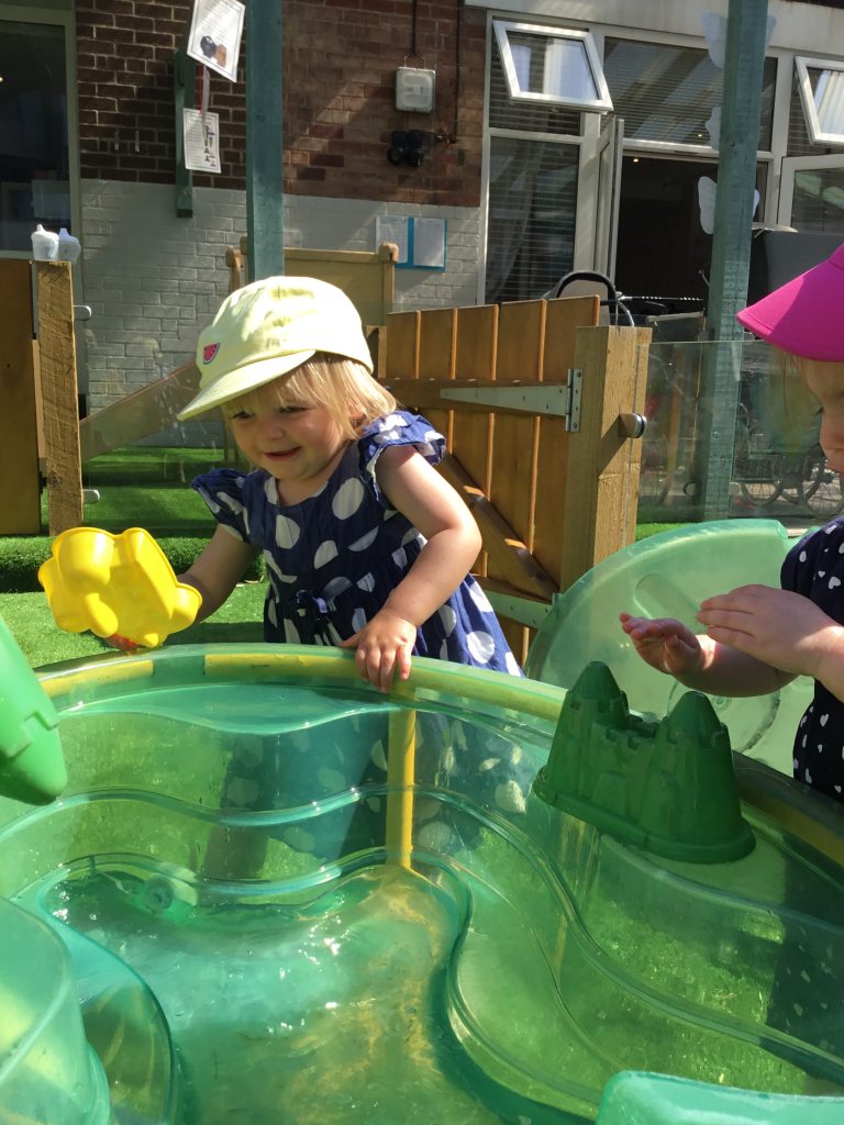 In the glorious weather we’ve had recently the under twos have been trying to keep cool by taking part in lots of water play. With cream and sun hats on, or playing in the shade, everyone was keen to dive into the water play.