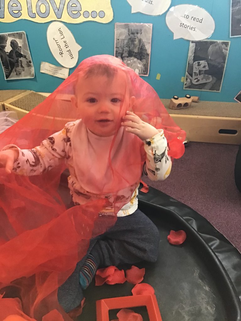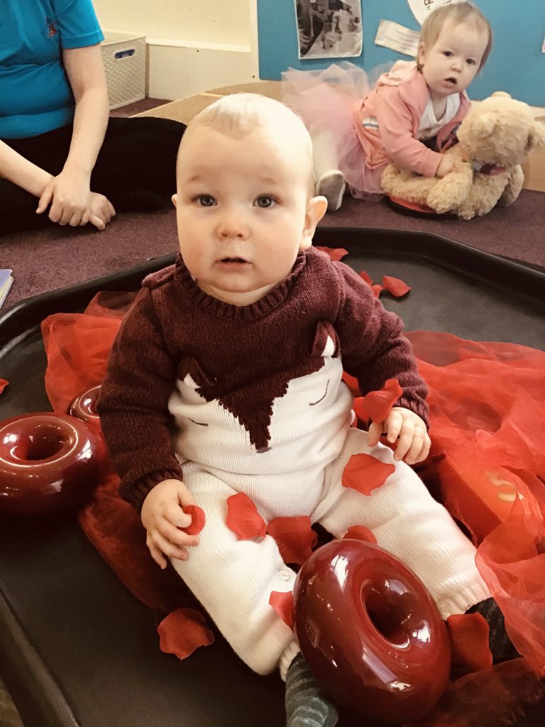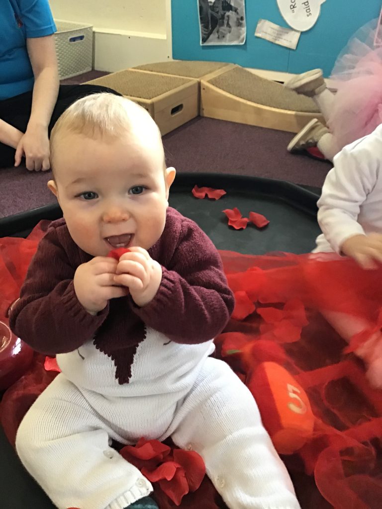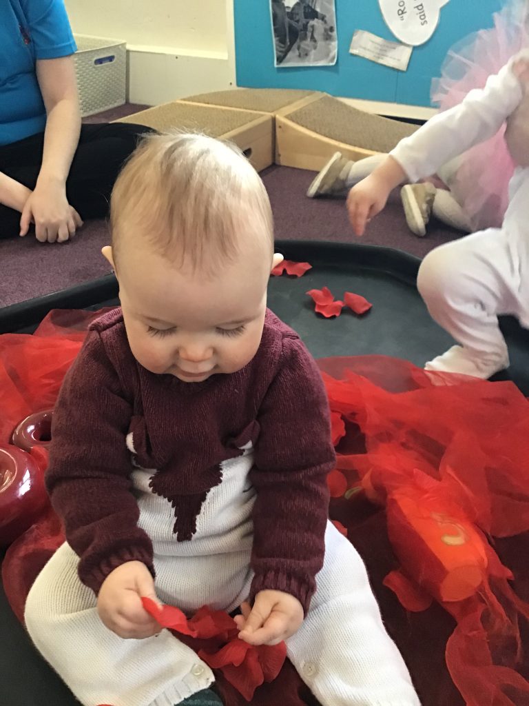 Meanwhile the babies were just as busy as they explored their Valentine’s tuff tray, experiencing the sensation of the various textures of the materials. The rose petals were a firm favourite!