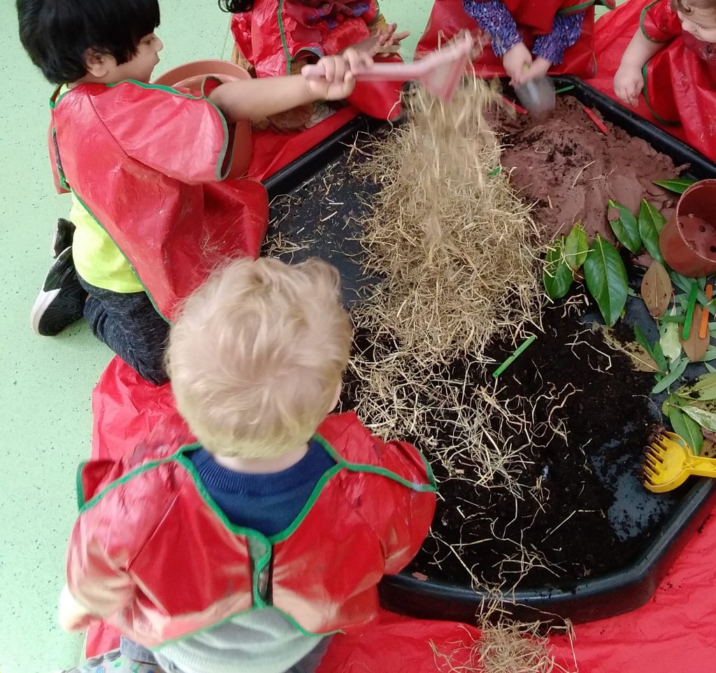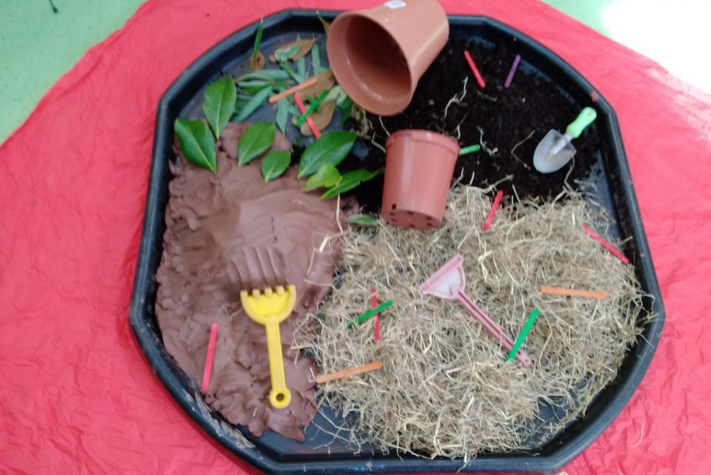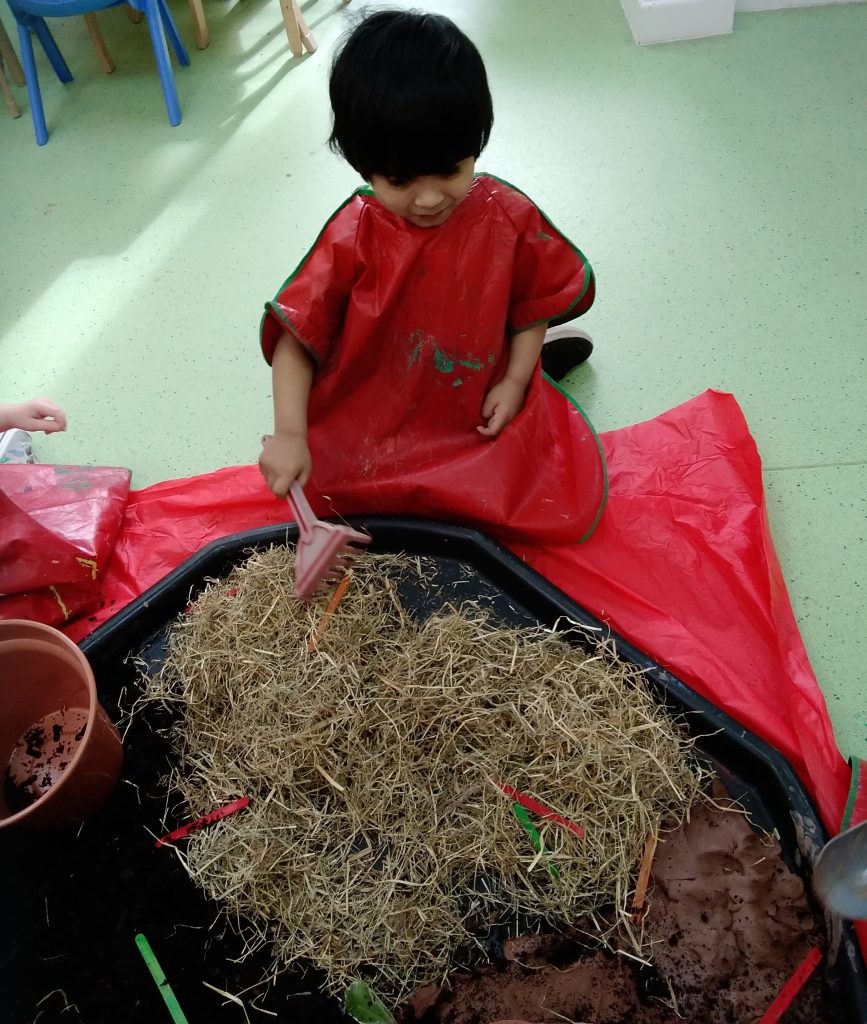 The messy nature tray has been a huge hit with the children. They have had the first hand experience of handling the different materials in the tray, feeling the textures of the clay, the hay, the mud and the leaves. There’s been plenty to chat about!