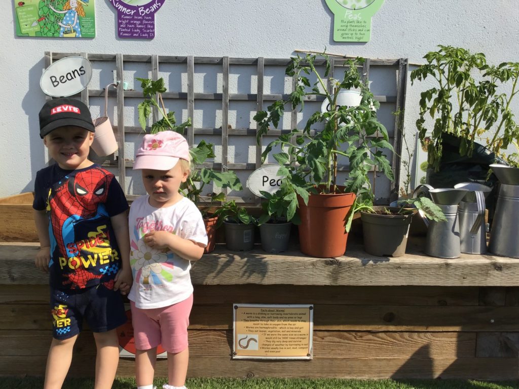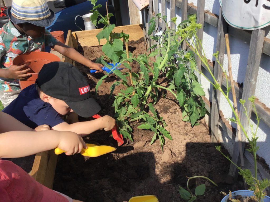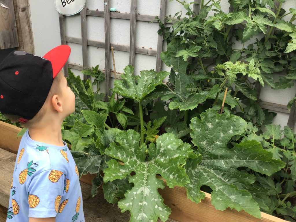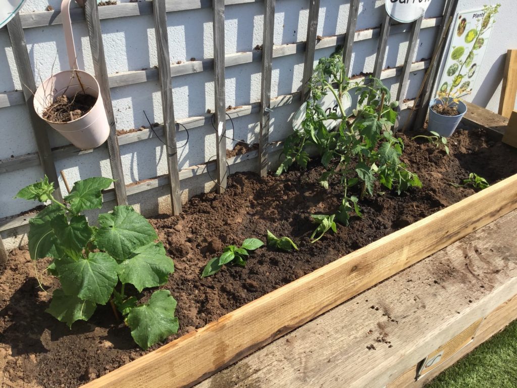 Just a few weeks later, the gardeners are really pleased to see how well everything has grown. Mini cucumbers are forming, and tiny tomatoes are appearing. We’re going to be keeping a close eye on how they continue to grow and can’t wait until they are ready to harvest for use in our lunch at nursery.