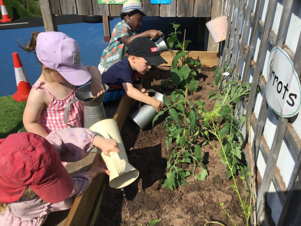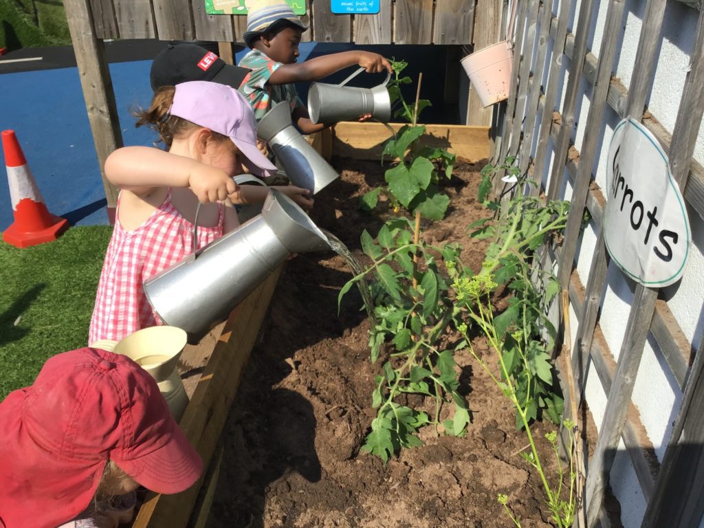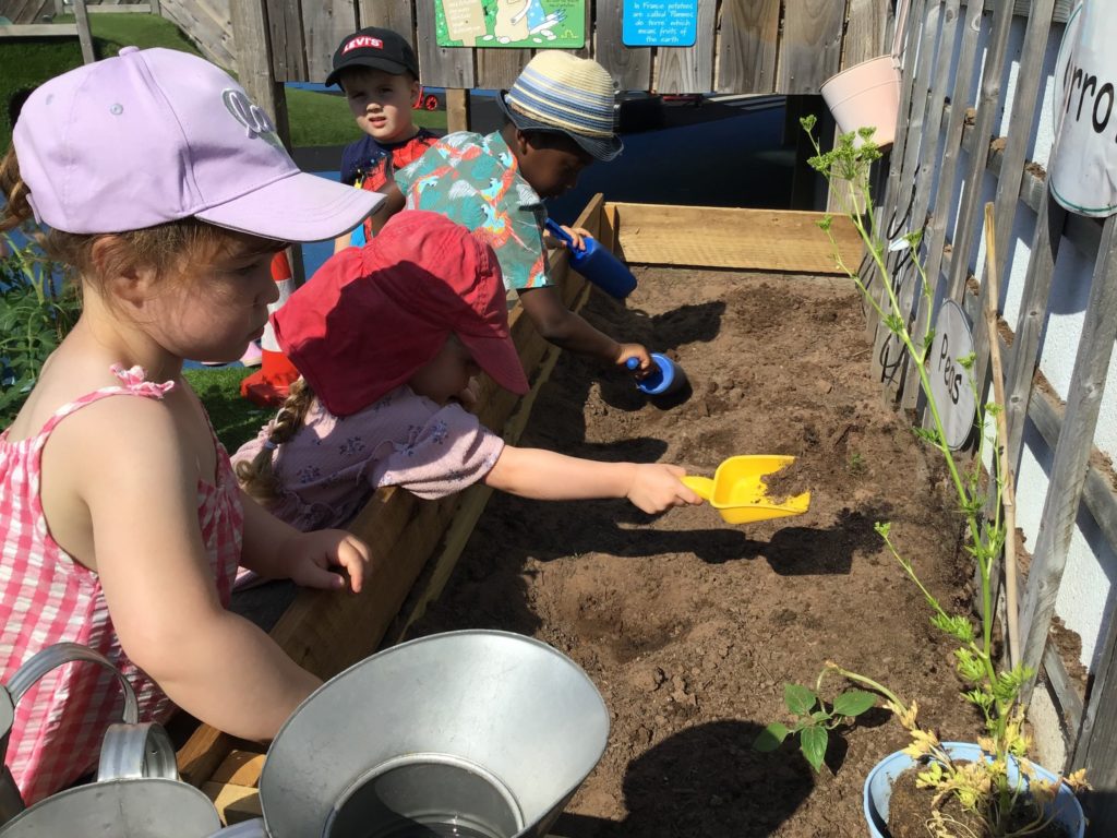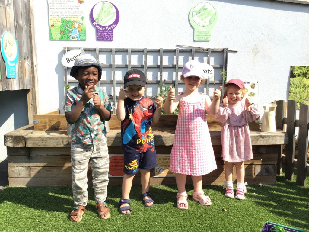 Just a few weeks later, the gardeners are really pleased to see how well everything has grown. Mini cucumbers are forming, and tiny tomatoes are appearing. We’re going to be keeping a close eye on how they continue to grow and can’t wait until they are ready to harvest for use in our lunch at nursery.