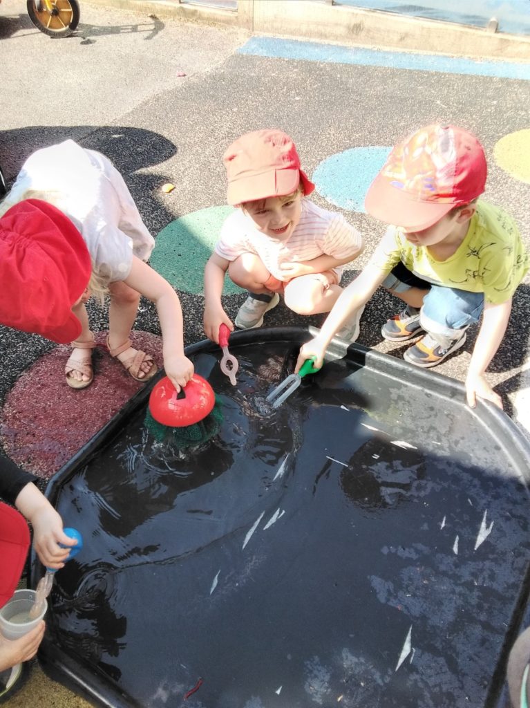 Then once the tray on the floor was getting full and we could see the water was about to go over the sides we spoke about what we could do next. “Move the water again,” said Joseph, so together we used all the different water toys to collect the water from the tray on the floor, these included pots, syringe toys and even the sponges. Then once the first water tray was filling up, we started the process again. Great teamwork Early Years!