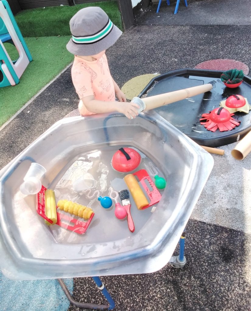 They started with water in one tray where the children did lots of splashing, feeling the different brushes and sponges and used the pots to do a filling and emptying movement. Miss Jess then got another tray and spoke to the children about how we could make the water travel from one tray to the other.