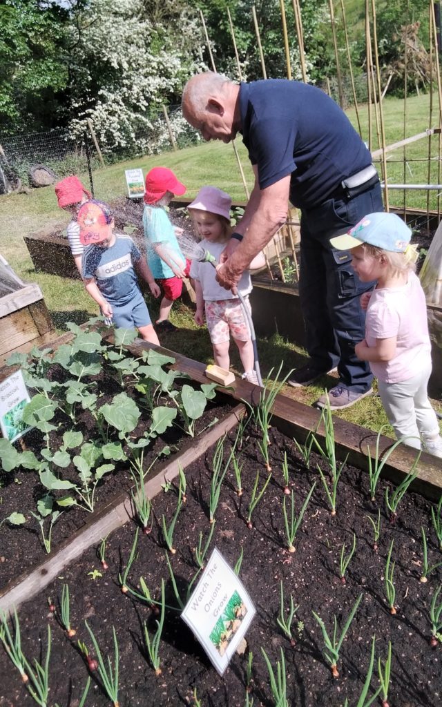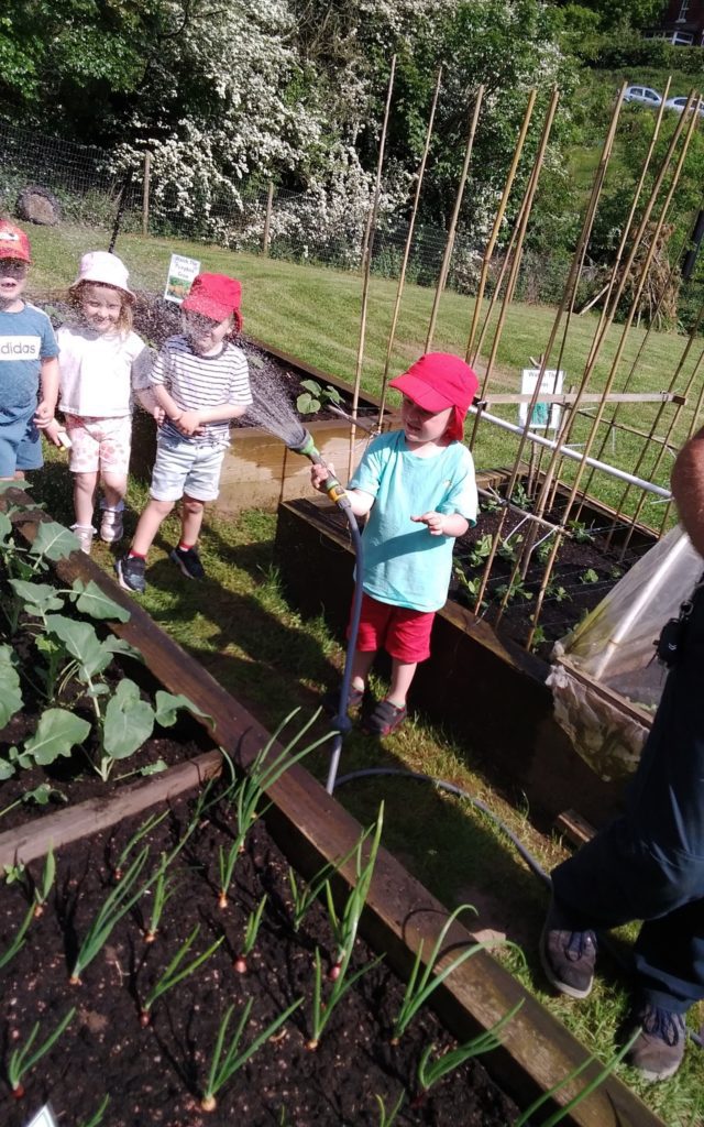 Our Early Years children have also been doing a very important job of helping Mr Peter water our planters this afternoon as the hot weather was making our crops dry out. In these planters there are lots of different fruits and vegetables such as onions, broccoli, carrots, cucumbers, potatoes, and strawberries. The children helped to plant these crops when they were just tiny seeds and now they were able to see how well their crops were growing.