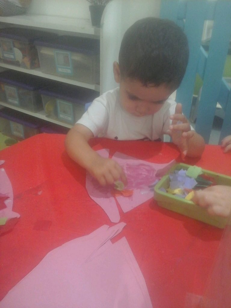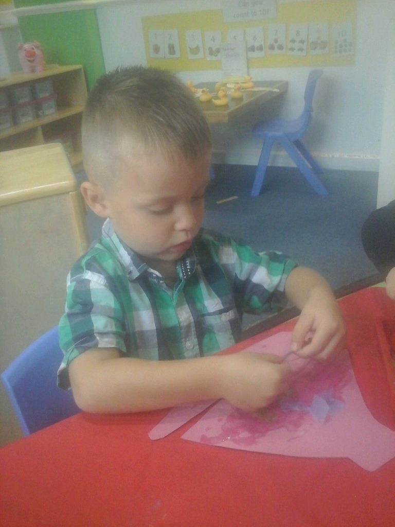 In Peter Rabbits the children loved getting extremely wet exploring lots of different methods of playing with water. They experimented with filling and emptying in the water tray, made big splashes in their wellies in the tuff tray, used paint brushes to water paint and even slipped down the slide into the water making huge splashes! It was clear to see the children were having a whale of a time. Inside the children also collaged their very own boat to take home using lots of coloured tissue paper.