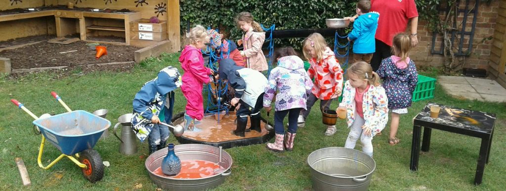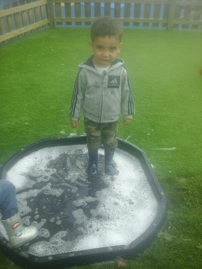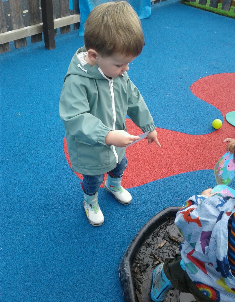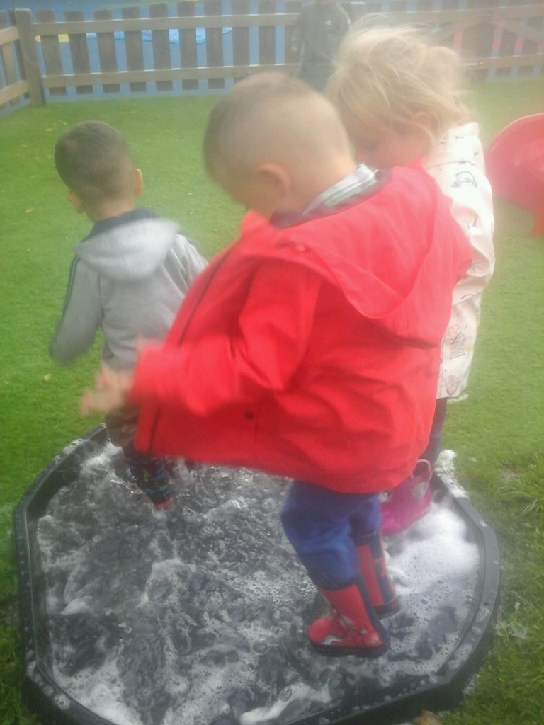 In our under 2’s unit the children looked at the photos of Peppa Pig in muddy puddles and then, outside in the garden, copied her by jumping in their own muddy puddle which they had created.