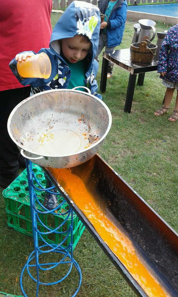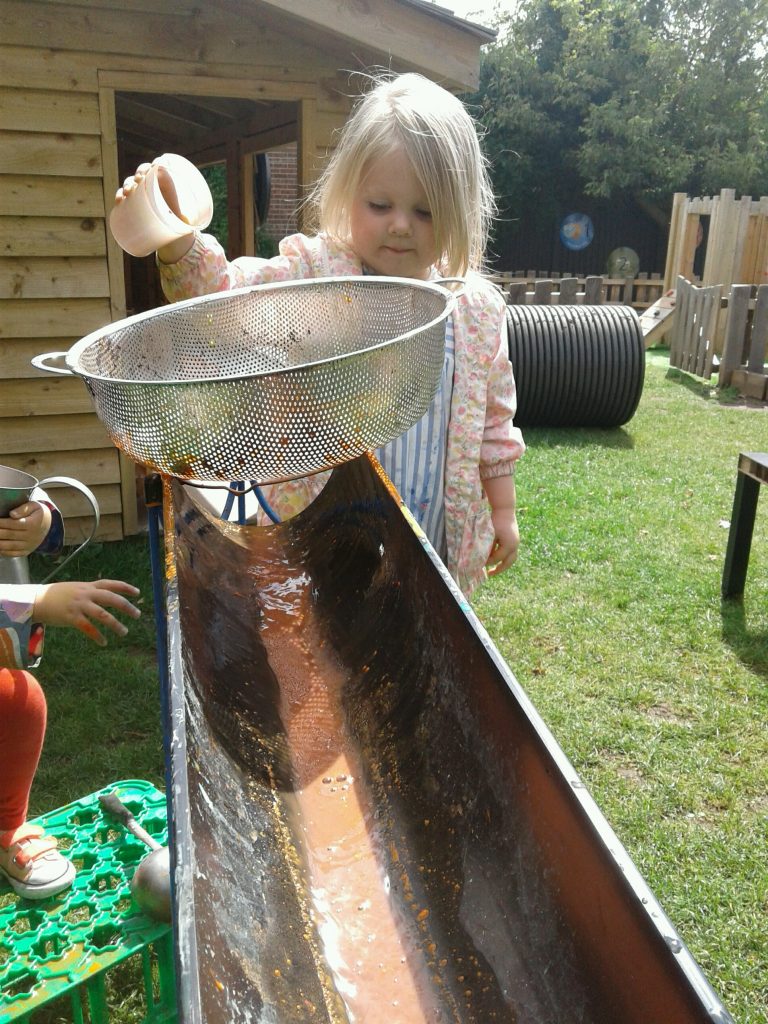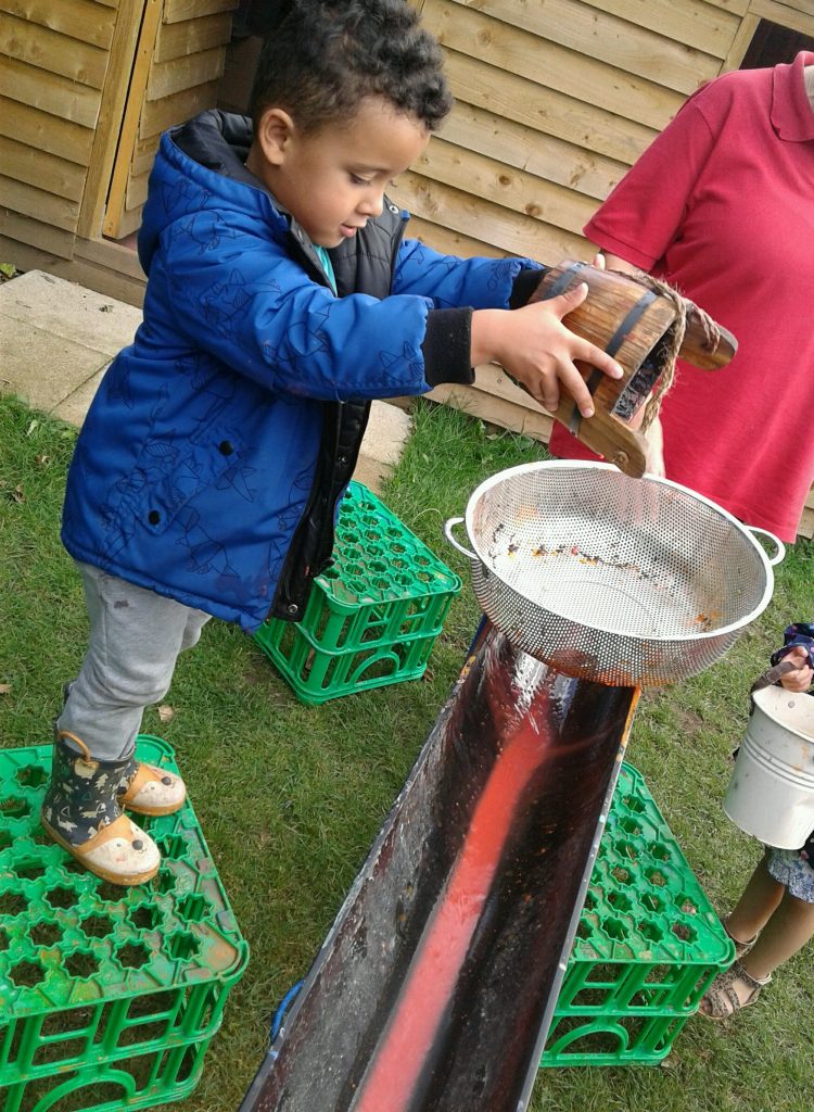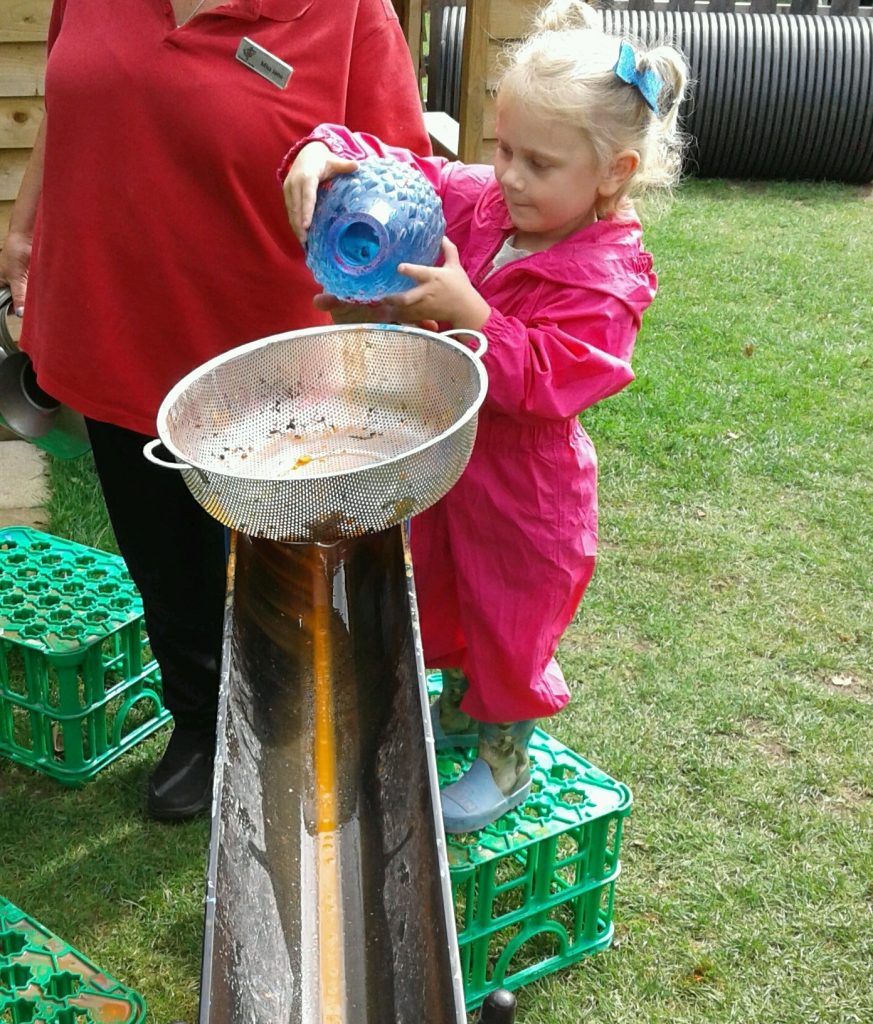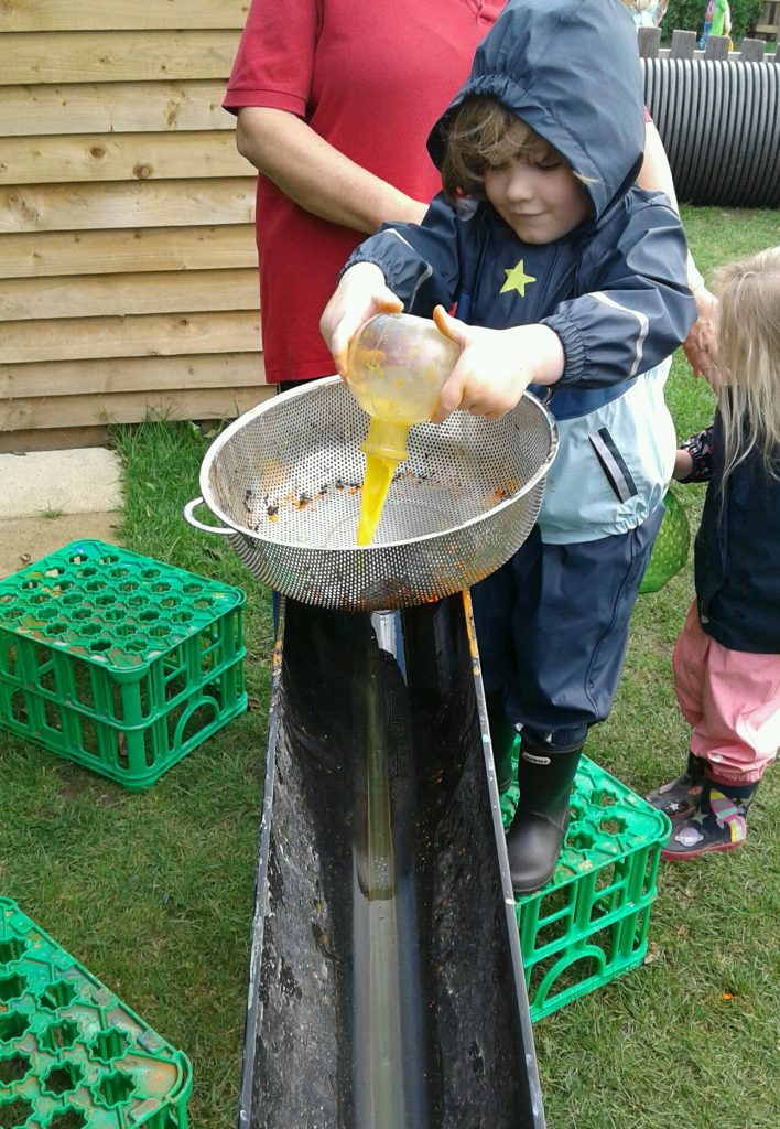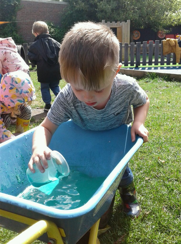 The early years’ children used water in the garden to explore colour. The children had fun mixing, filling, pouring, stirring and transferring water using pipes, jugs, buckets, sieves and bottles. They were very excited to see what colours they could make. When they poured the water down the drain pipe, they watched as it changed colour as it met the more water at the bottom.
