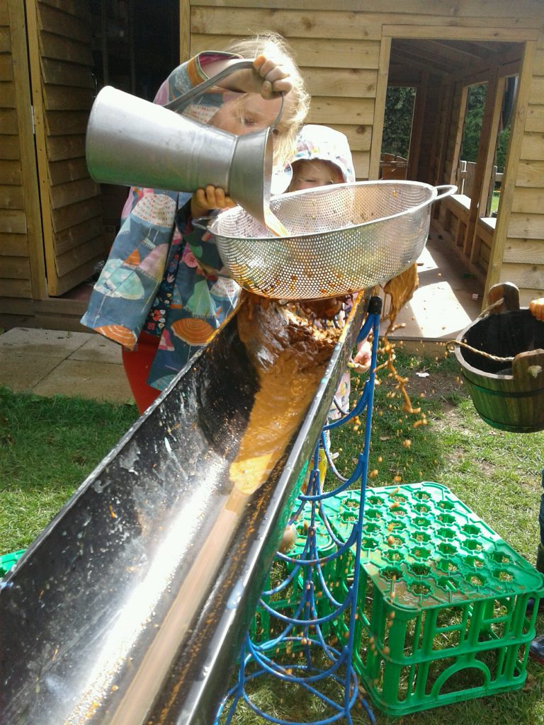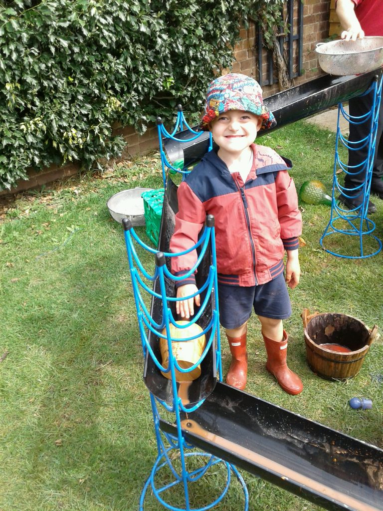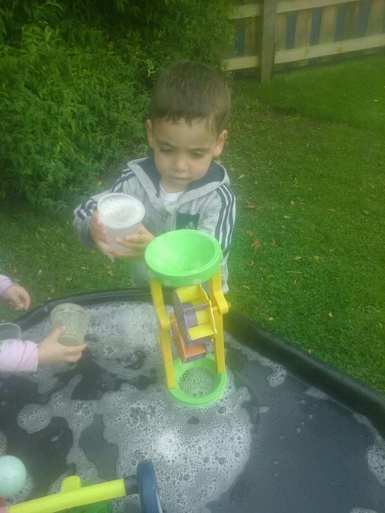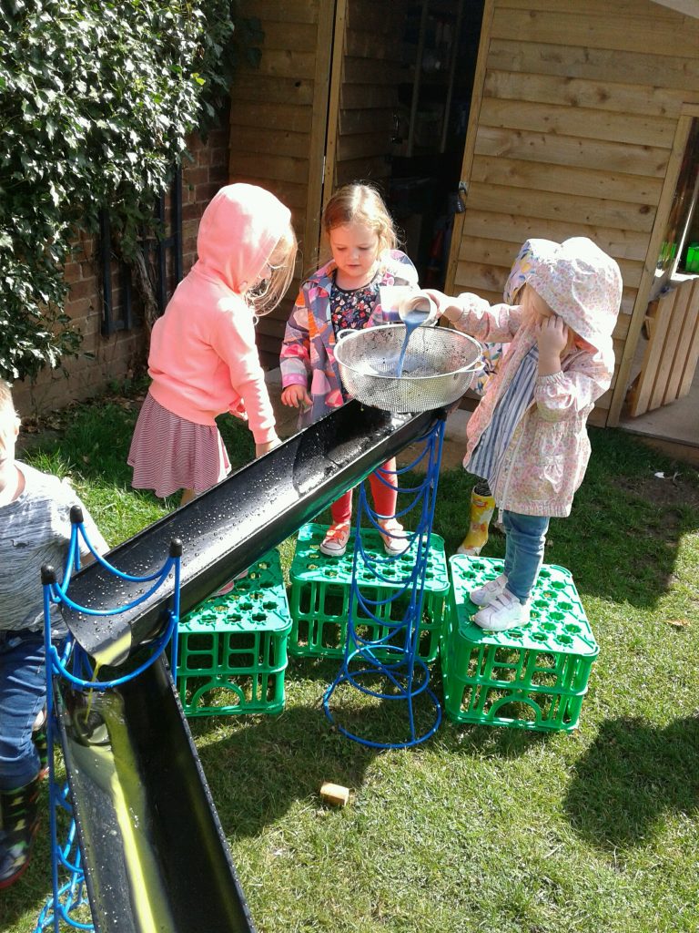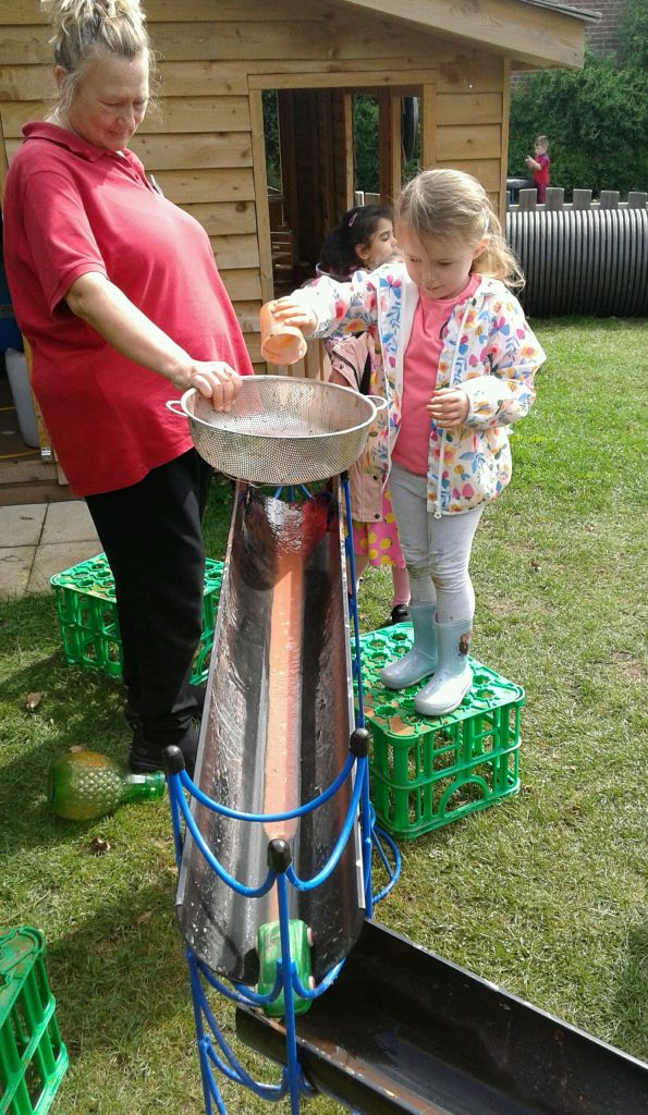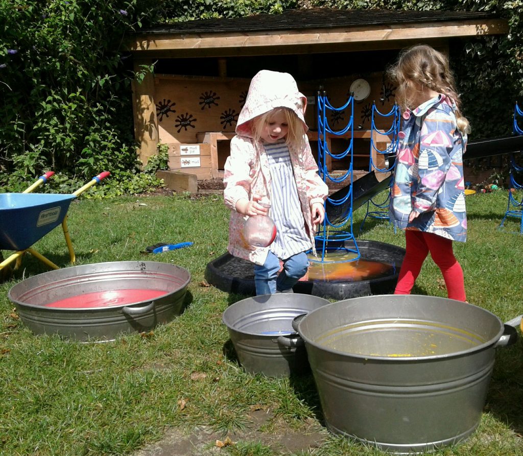 The early years’ children used water in the garden to explore colour. The children had fun mixing, filling, pouring, stirring and transferring water using pipes, jugs, buckets, sieves and bottles. They were very excited to see what colours they could make. When they poured the water down the drain pipe, they watched as it changed colour as it met the more water at the bottom.