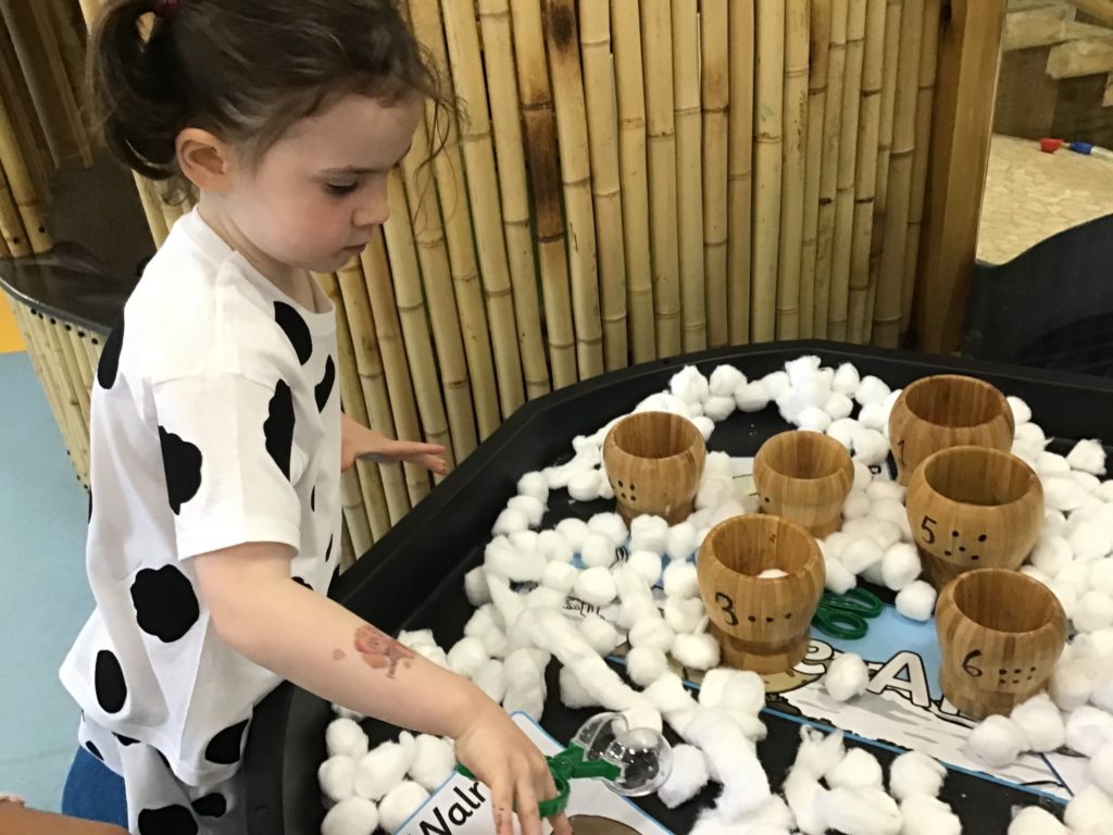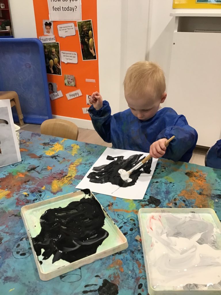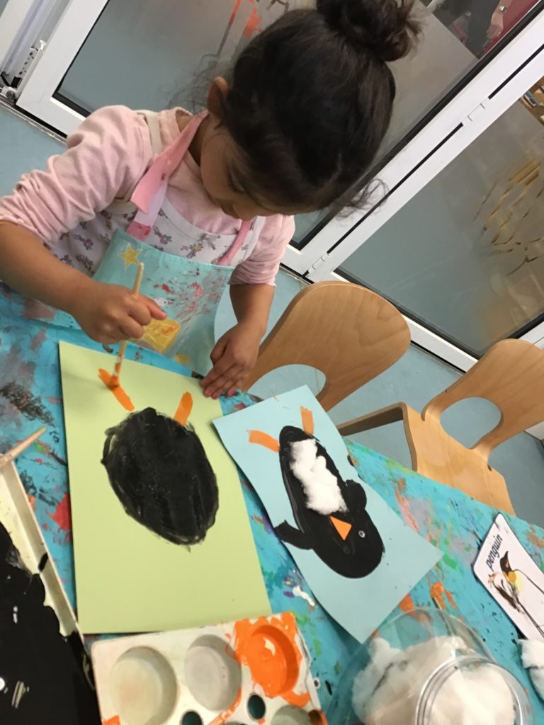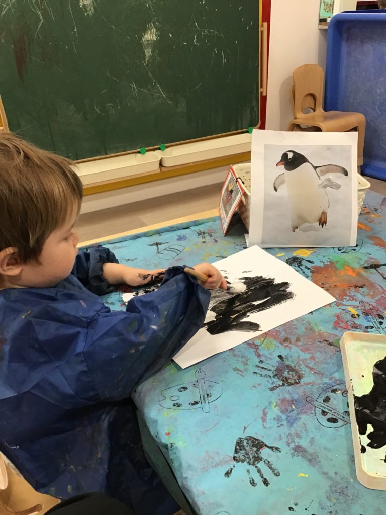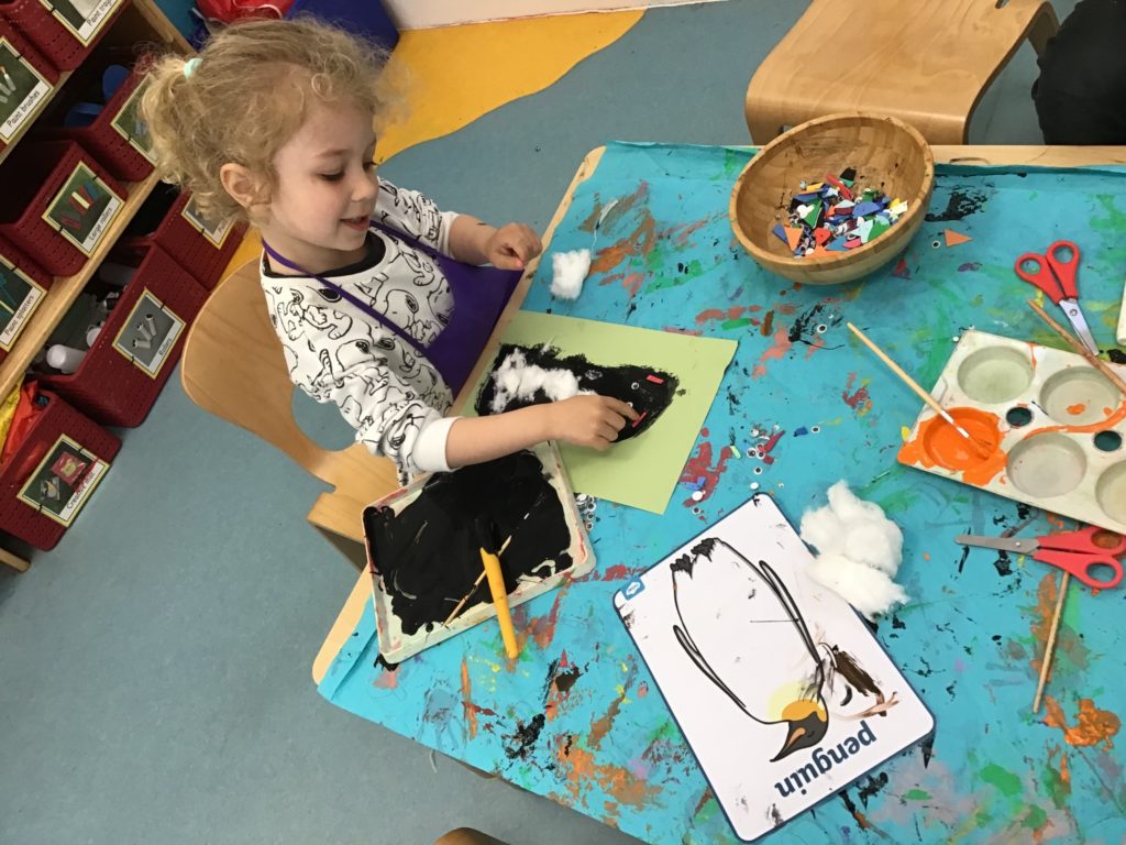 The children enjoyed a variety of conversations with members of staff and their friends using words such as ‘waddle’, ‘huddle’, ‘cold’ and ‘igloo’. They painted pictures of penguins and looked at information books to find out more about them.