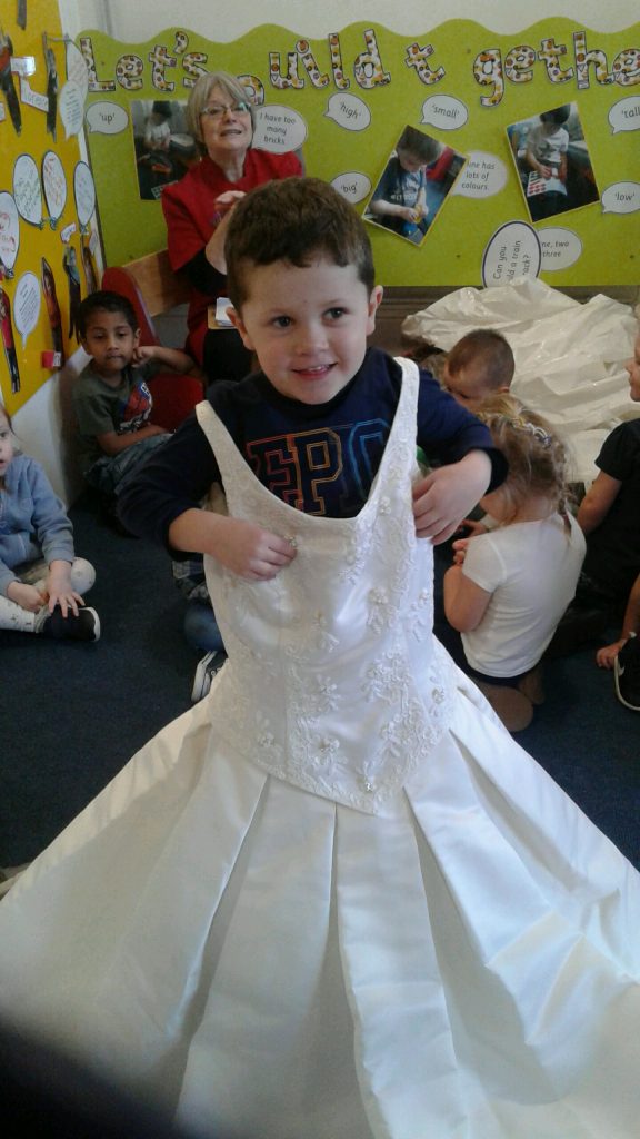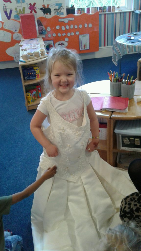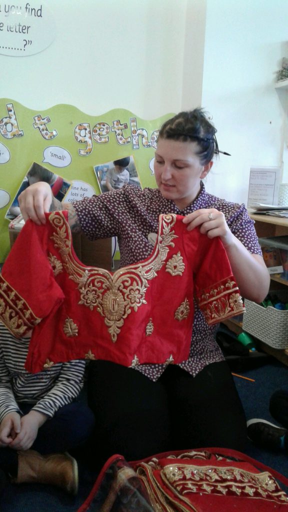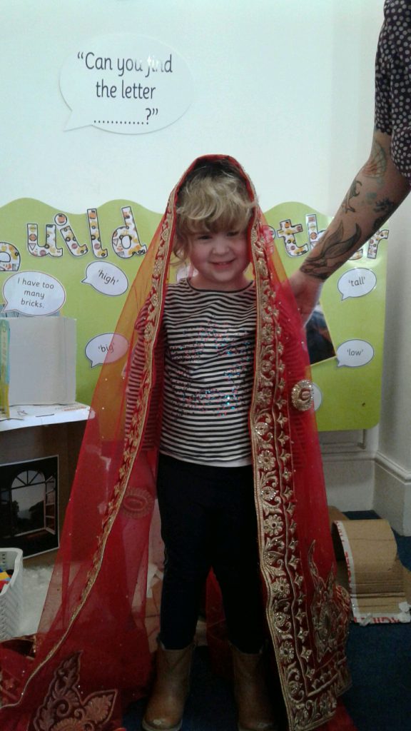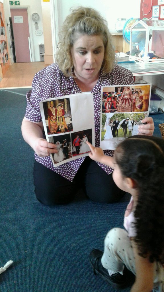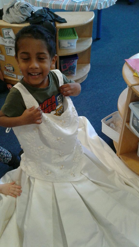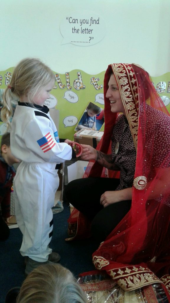 Our celebration of this special day focused on weddings. Miss Mala and Miss Jayne kindly brought in their wedding dresses to show the children. The children really enjoyed trying them on and talking about the similarities and differences between them. We found out that guests at weddings like to wear their best clothes for the event and looked at the beautiful henna decorations at some weddings.