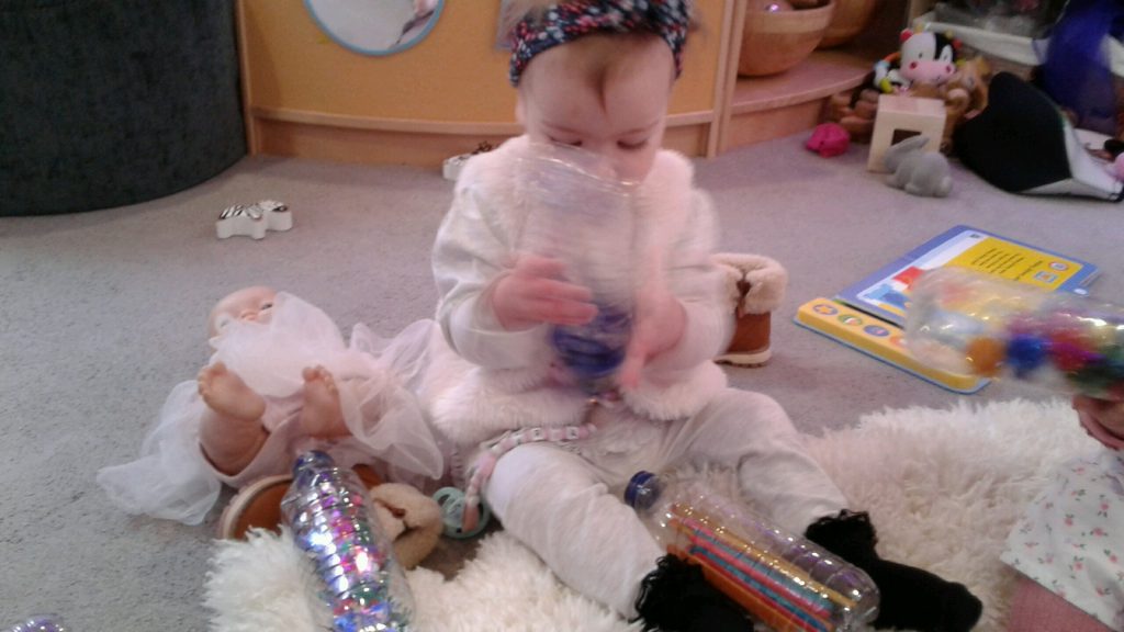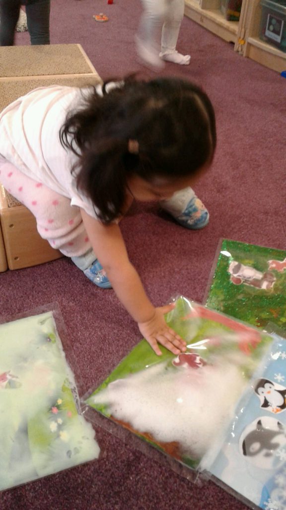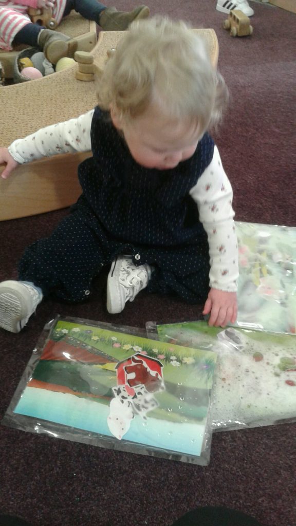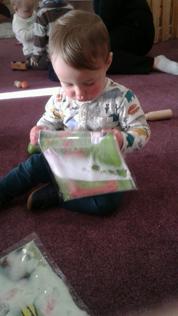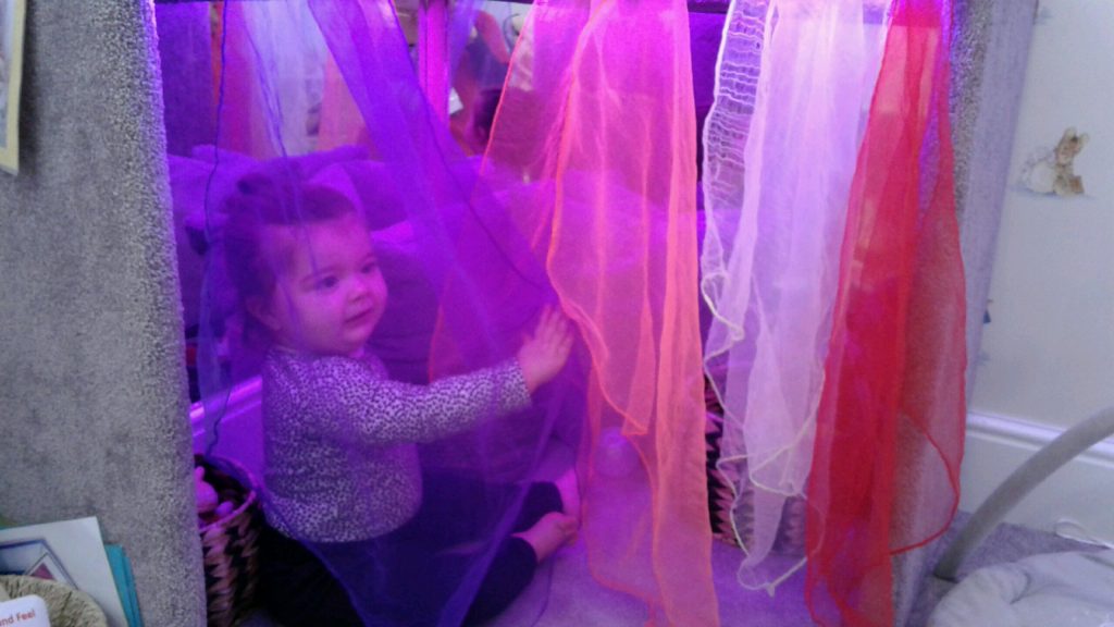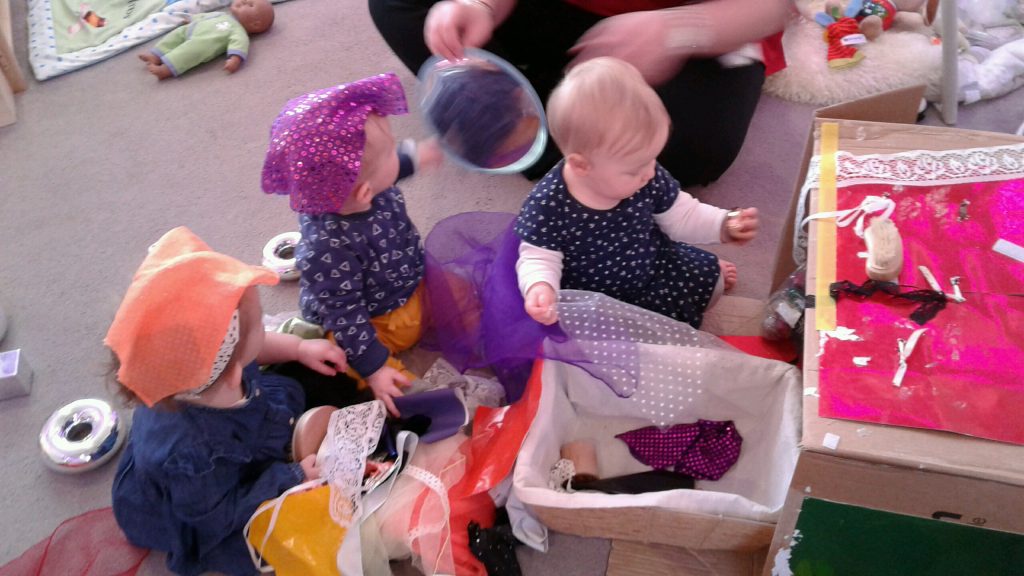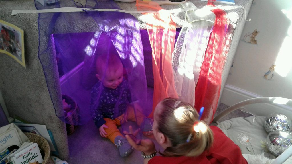 The younger children enjoyed playing with our sensory bags which were filled with exciting things for them to explore. Also, the sensory baskets filled with interesting textures and materials were a hit with our babies. As the photos show, they loved peeping through the chiffon scarves fronting their little den.