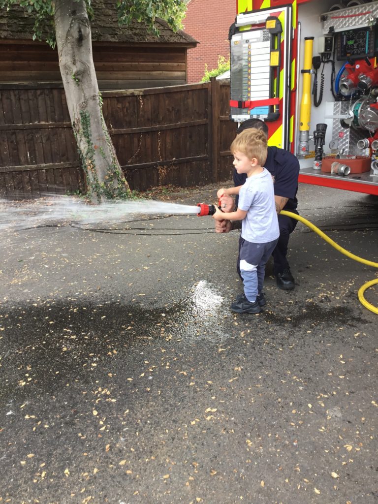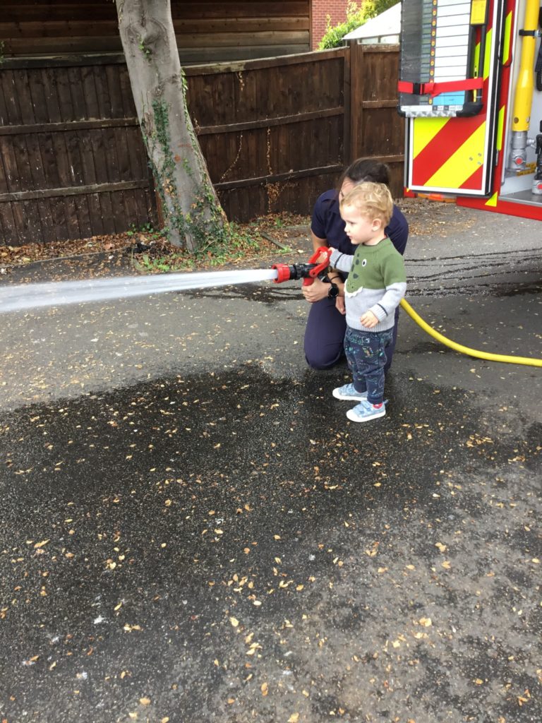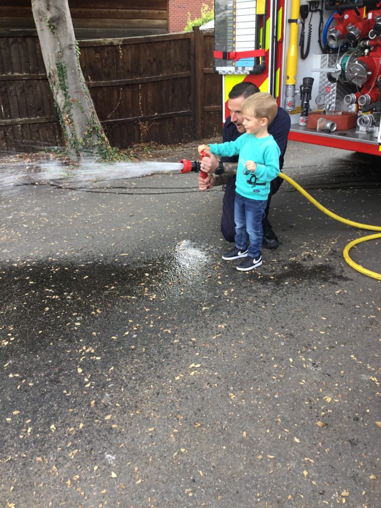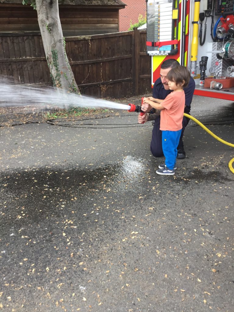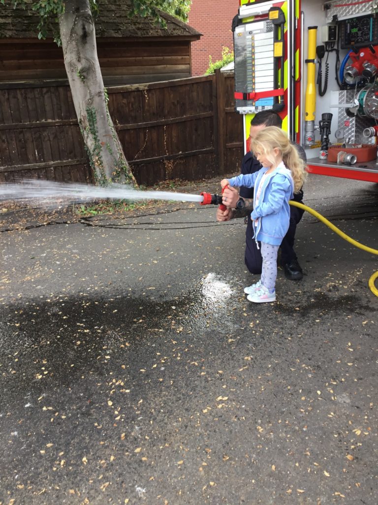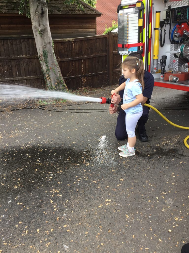 Afterwards the children had the opportunity to spray the fire hose in the car park! They were all so amazed and excited. We even had a waterfall spray over us when one of the firefighters sprayed up to the sky!
