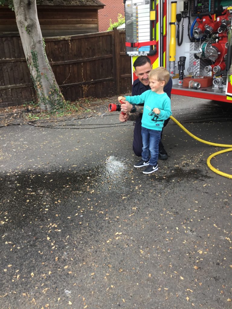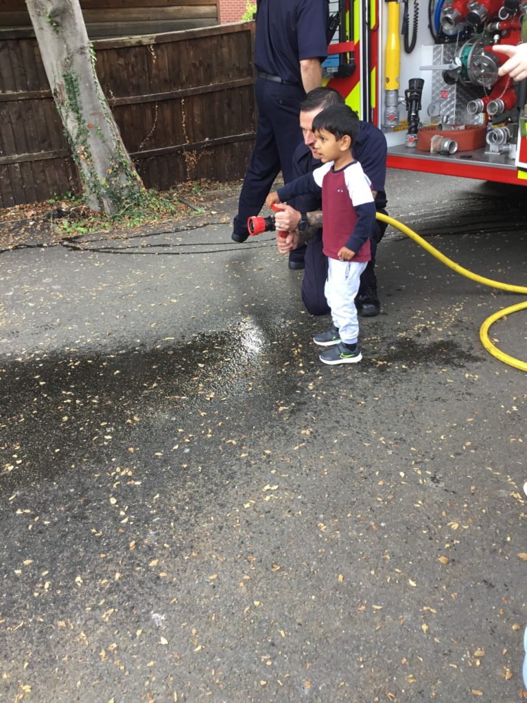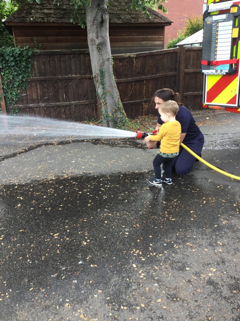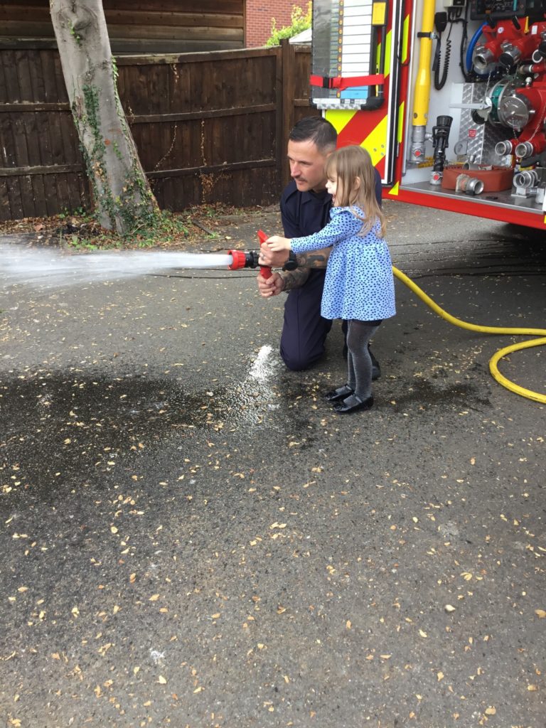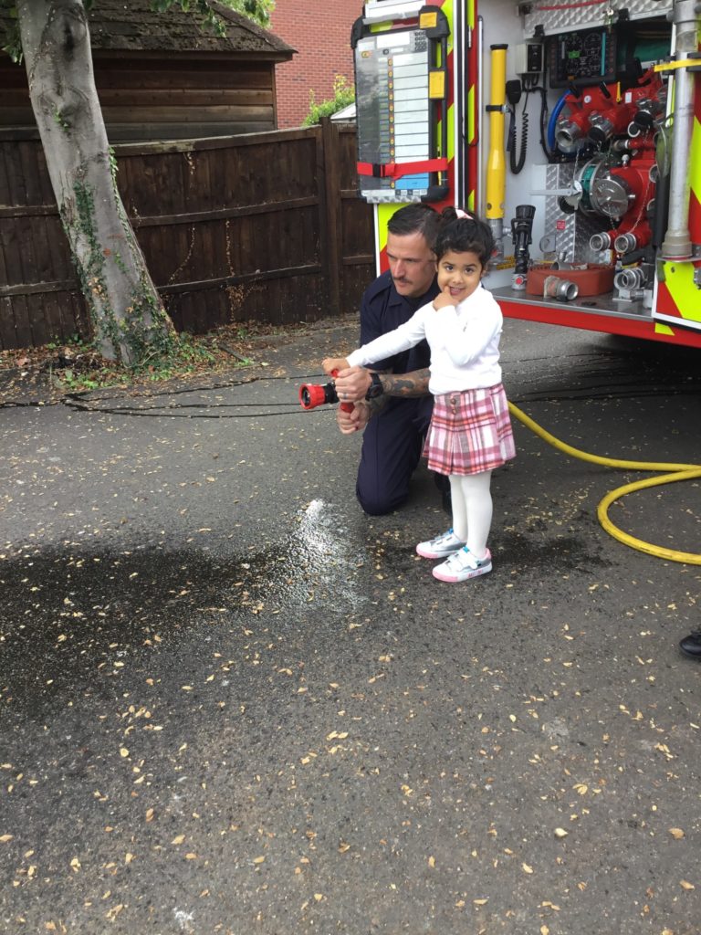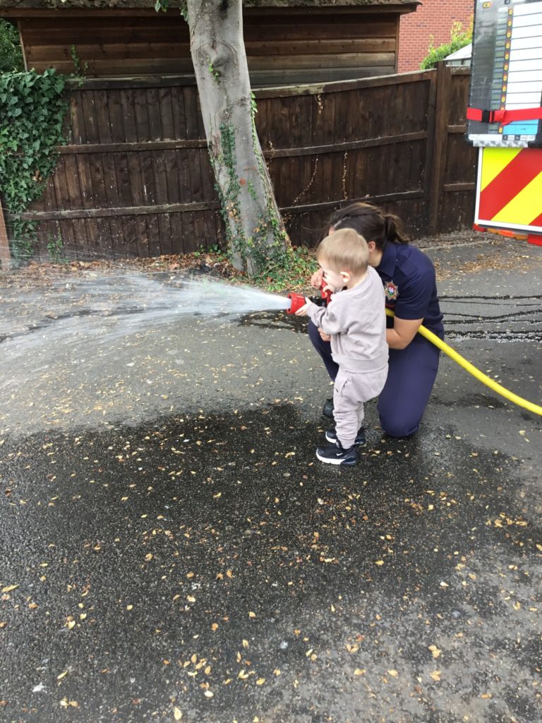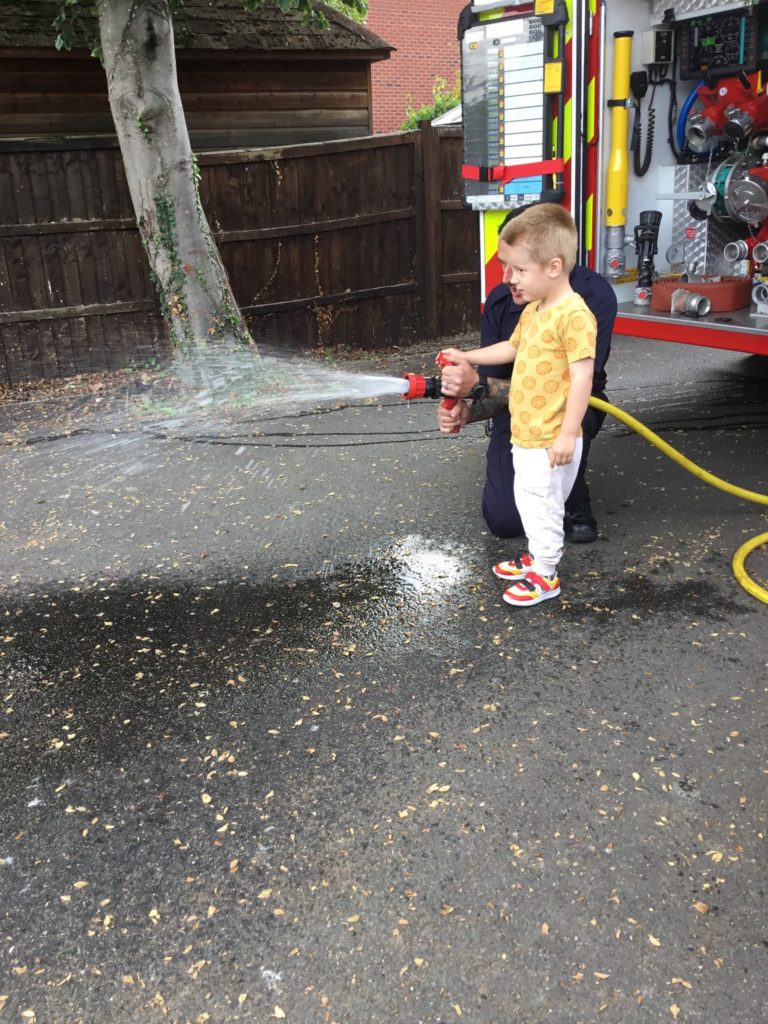 Afterwards the children had the opportunity to spray the fire hose in the car park! They were all so amazed and excited. We even had a waterfall spray over us when one of the firefighters sprayed up to the sky!